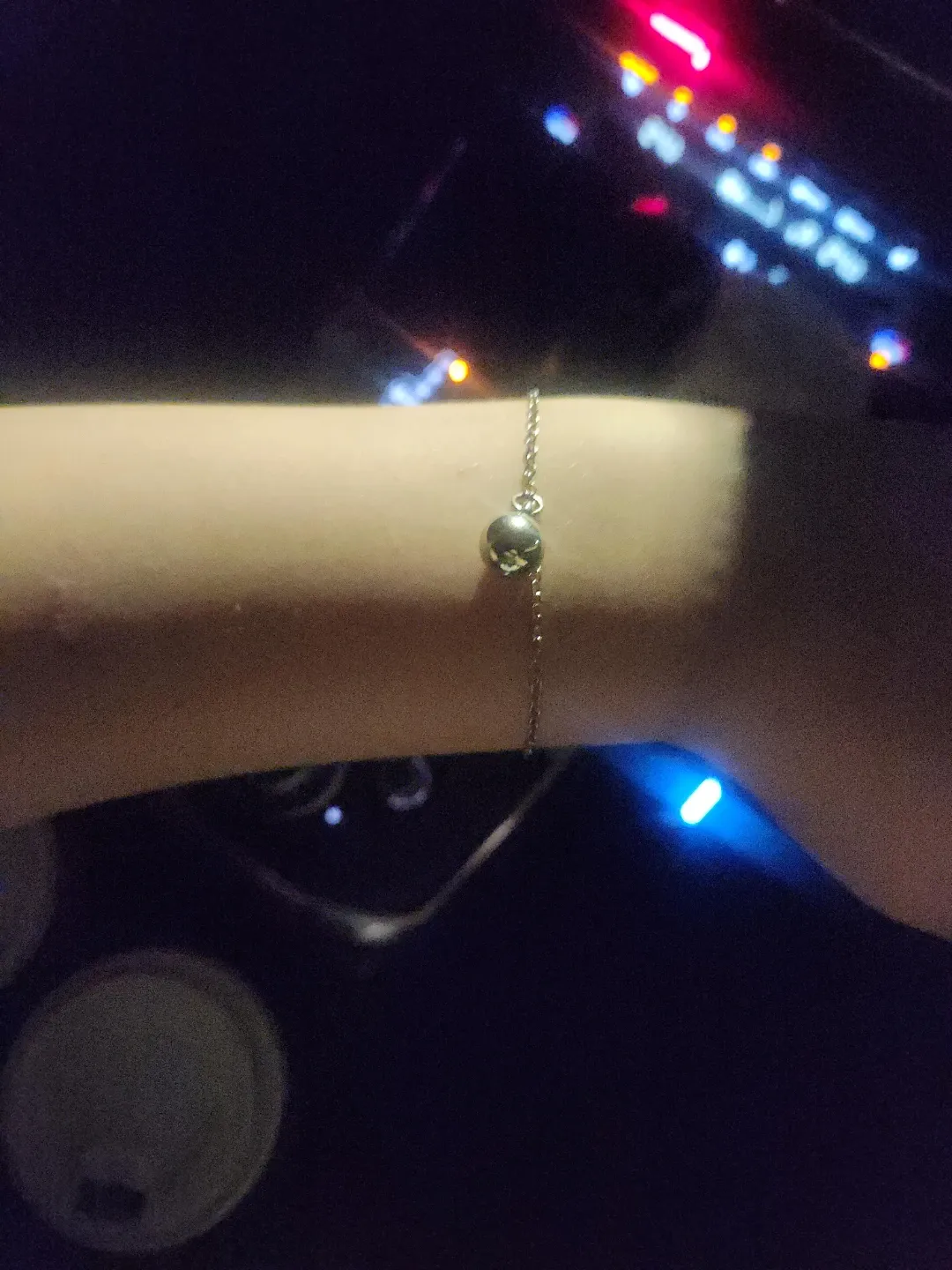 A delicate silver-tone bracelet featuring a small ball charm. This bracelet adds a subtle touch to any outfit. It's suitable for everyday wear.