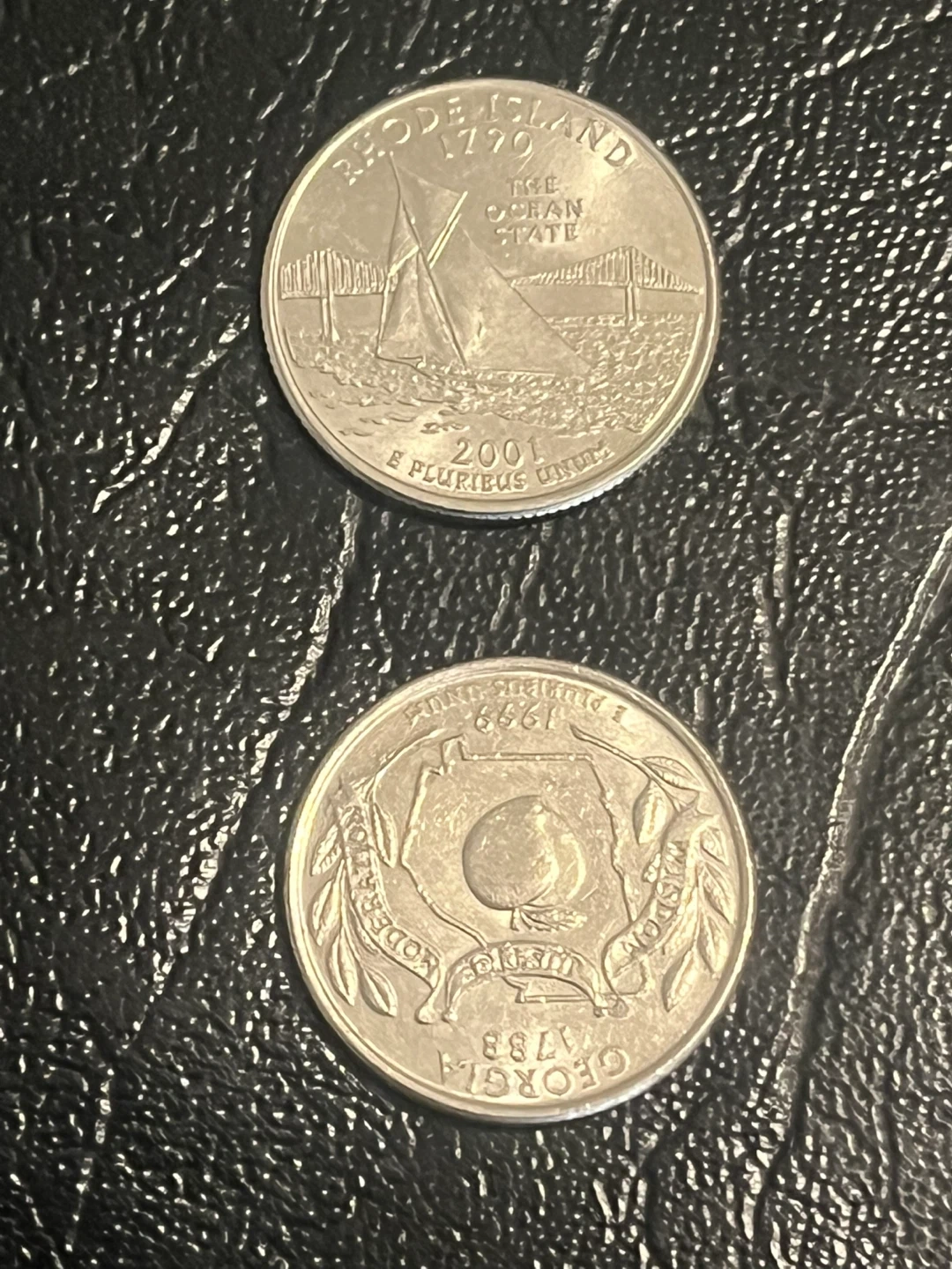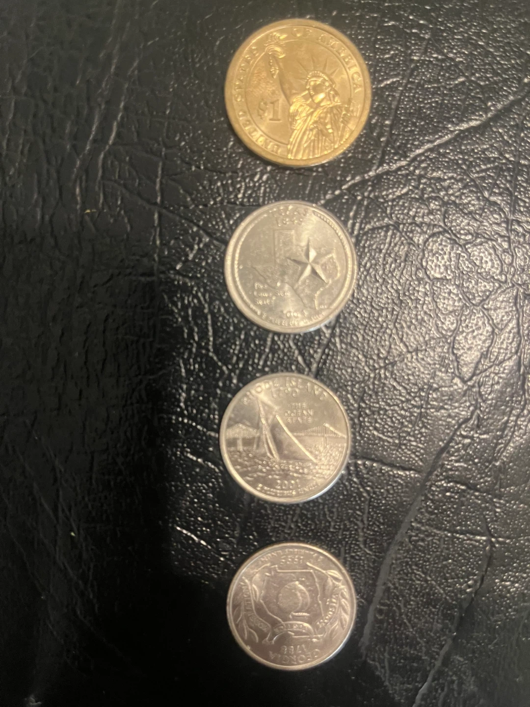 This lot includes one US dollar coin featuring Sacagawea and four state quarters: Texas (2004), Rhode Island (2001), and Georgia (1999). Also included is a commemorative coin featuring Chester Arthur, 21st President.