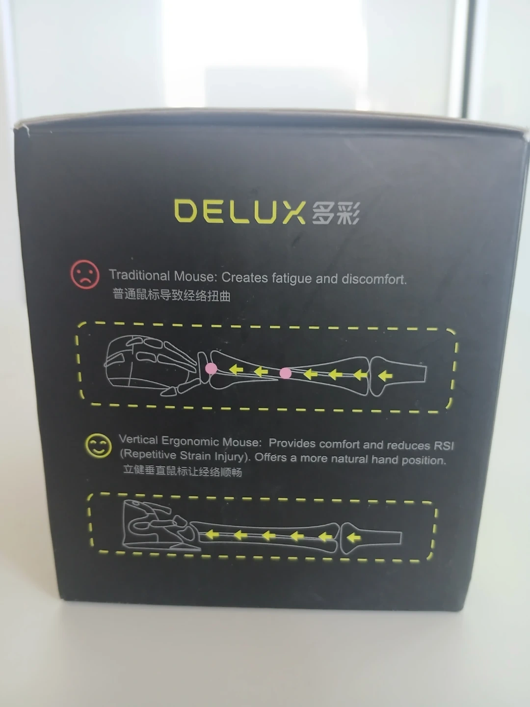 This is a DELUX M618PLUS ergonomic vertical mouse. It offers an anti-slip design and accurate tracking. It features a removable palm rest and 5 keys. Provides comfort and reduces RSI with a more natural hand position.