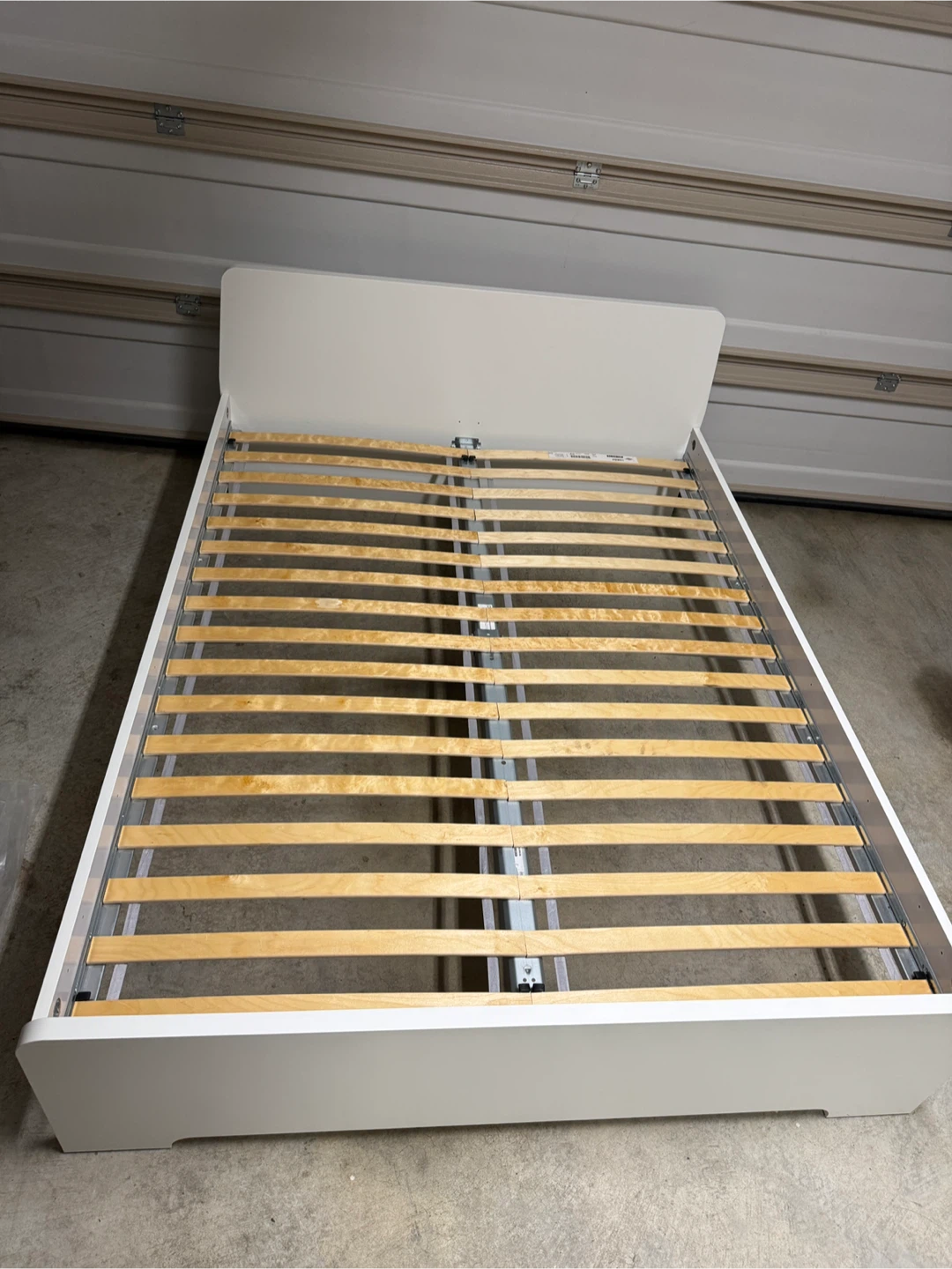 Gently used Queen size bed frame in excellent condition — very clean and almost like new. Sturdy wooden slats provide great support, no box spring needed.