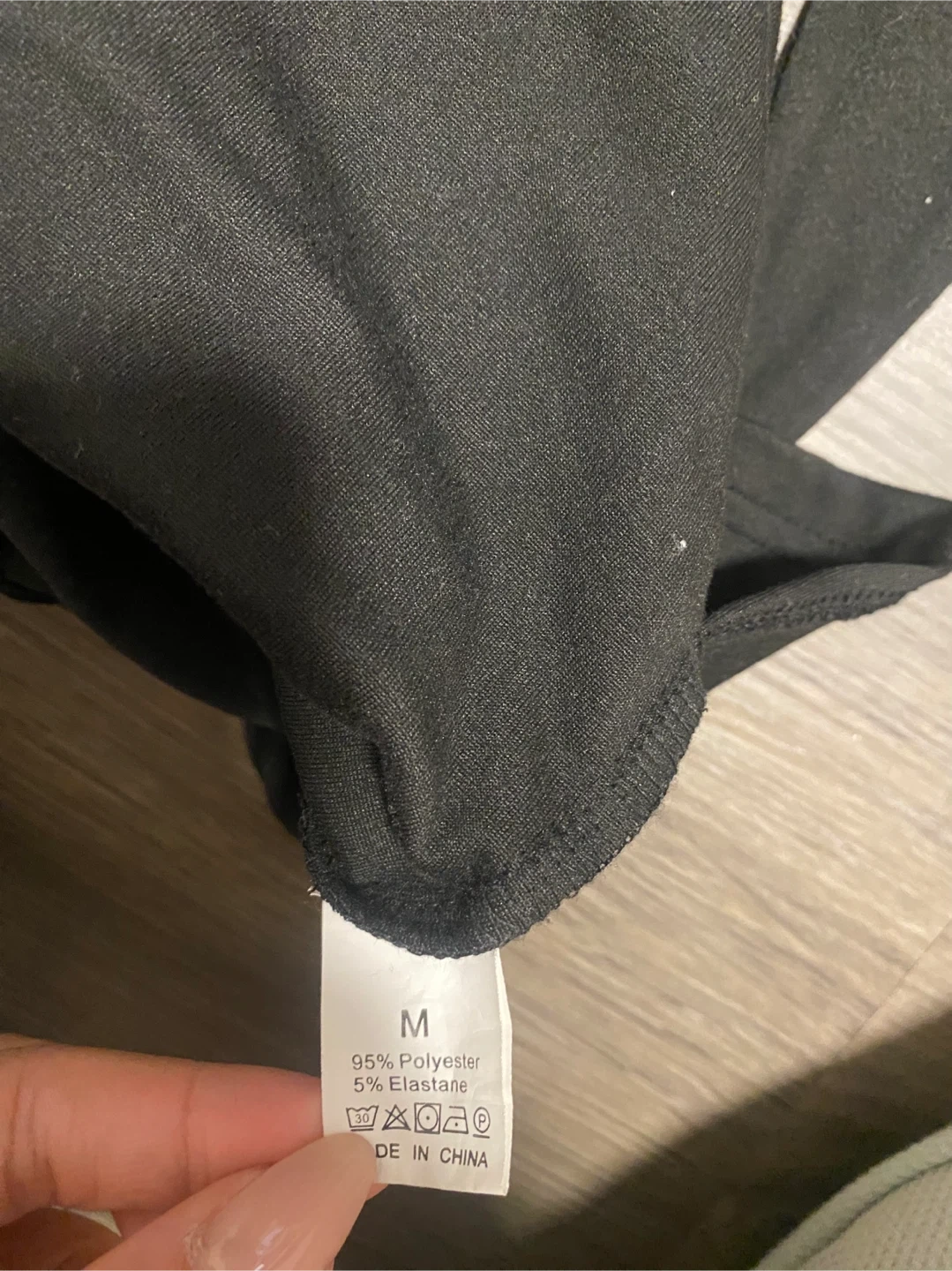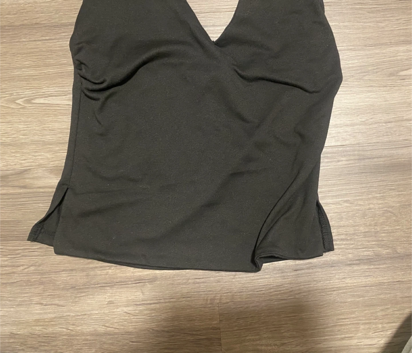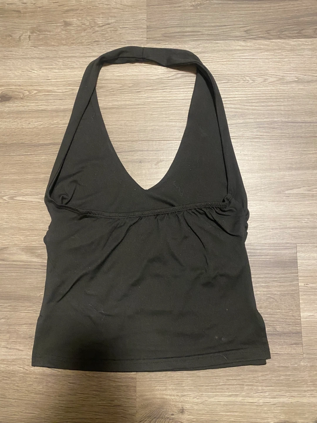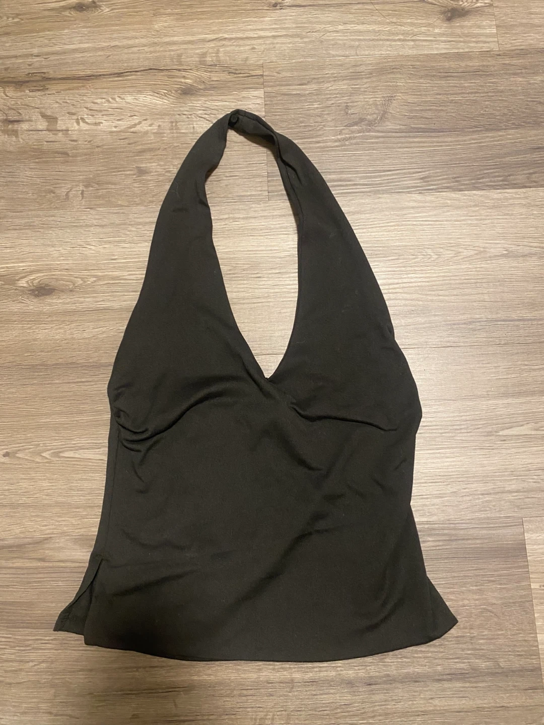 Black halter neck top in size medium. It's made of 95% polyester and 5% elastane. There are slits on each side.