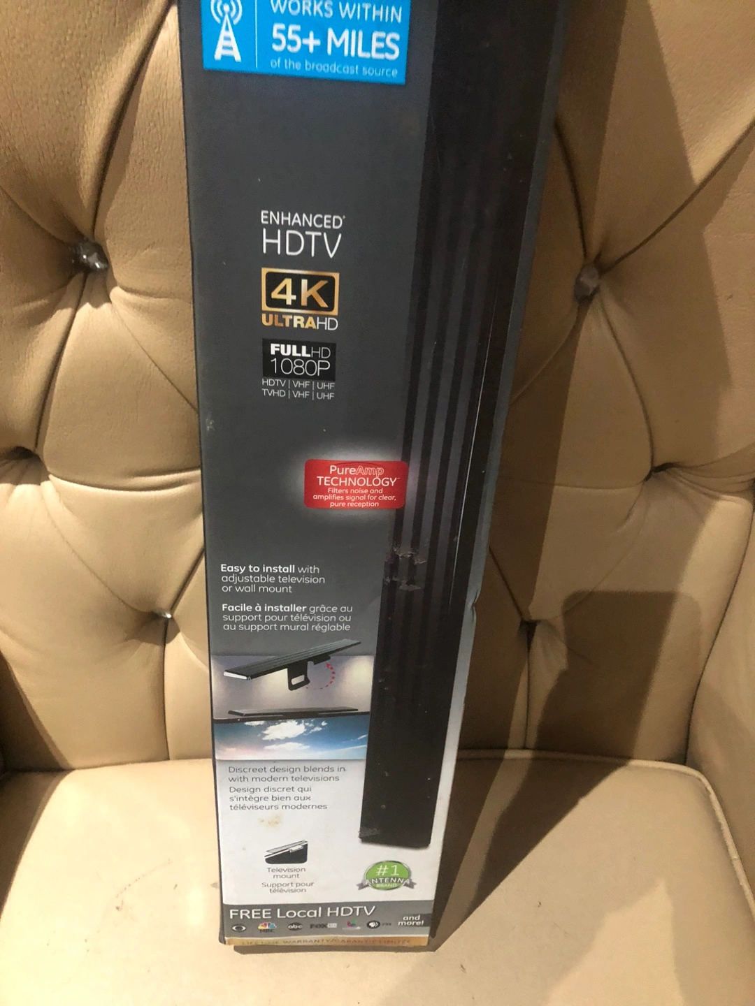 Indoor amplified antenna. Works within 55+ miles. Enjoying your favorite shows will be so much more relaxing with this item.