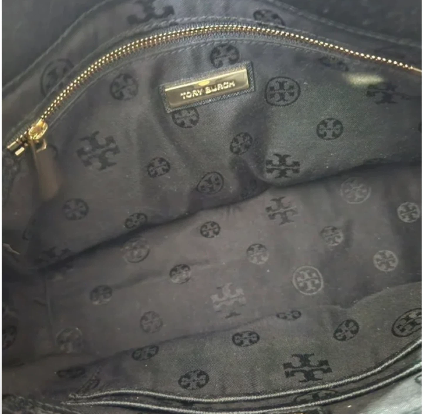 This is a black Tory Burch leather tote handbag. It features a zip closure and gold-tone hardware. The interior is lined with black fabric and has the Tory Burch logo pattern.