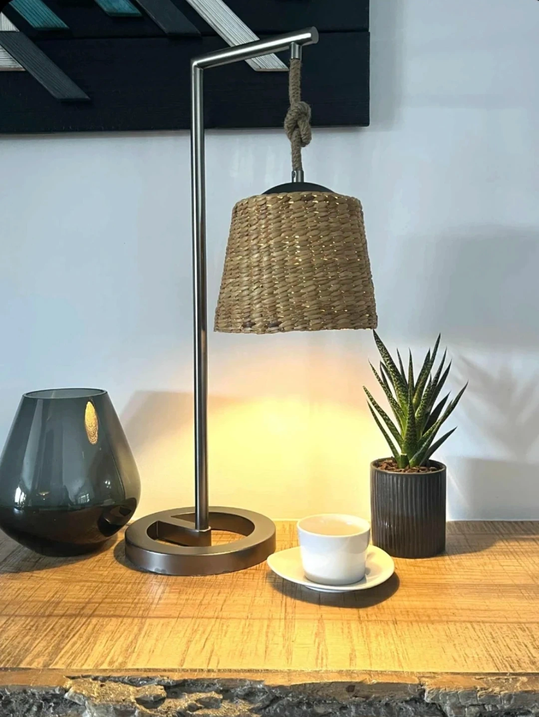 This stylish handwoven basket lamp adds a natural, cozy touch to any space. Designed with a modern metal stand and a woven basket shade, it casts a warm ambient glow—perfect for side tables, consoles, or reading corners.