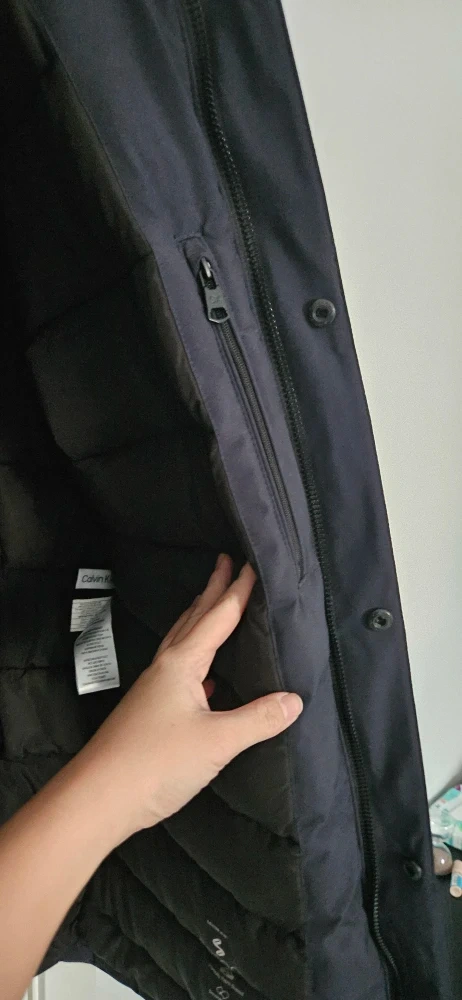 Here's a Calvin Klein winter jacket in great condition! It's a size large and features Sorona Aura insulation, which is partially plant-based. The jacket is navy and made with 100% polyester for the shell, lining, and filler. It has a smooth feel and exceptional softness, plus breathable insulation to keep you cozy