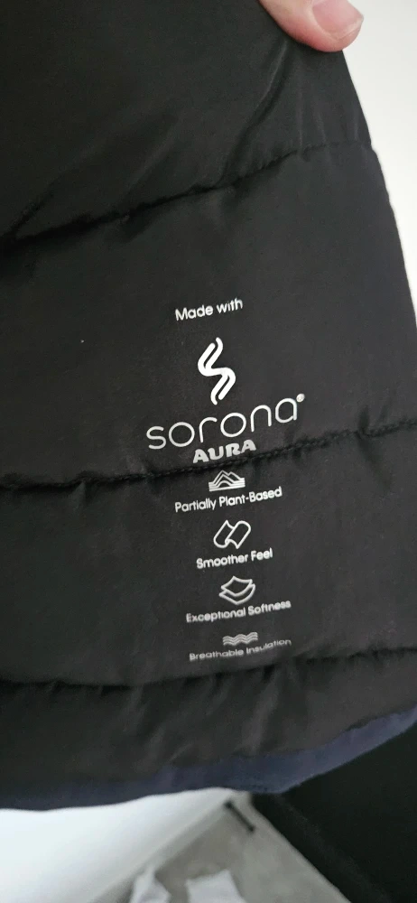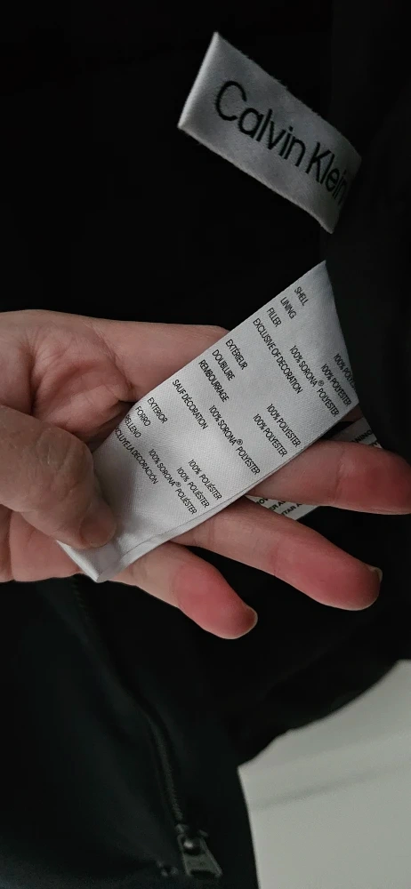 Here's a Calvin Klein winter jacket in great condition! It's a size large and features Sorona Aura insulation, which is partially plant-based. The jacket is navy and made with 100% polyester for the shell, lining, and filler. It has a smooth feel and exceptional softness, plus breathable insulation to keep you cozy