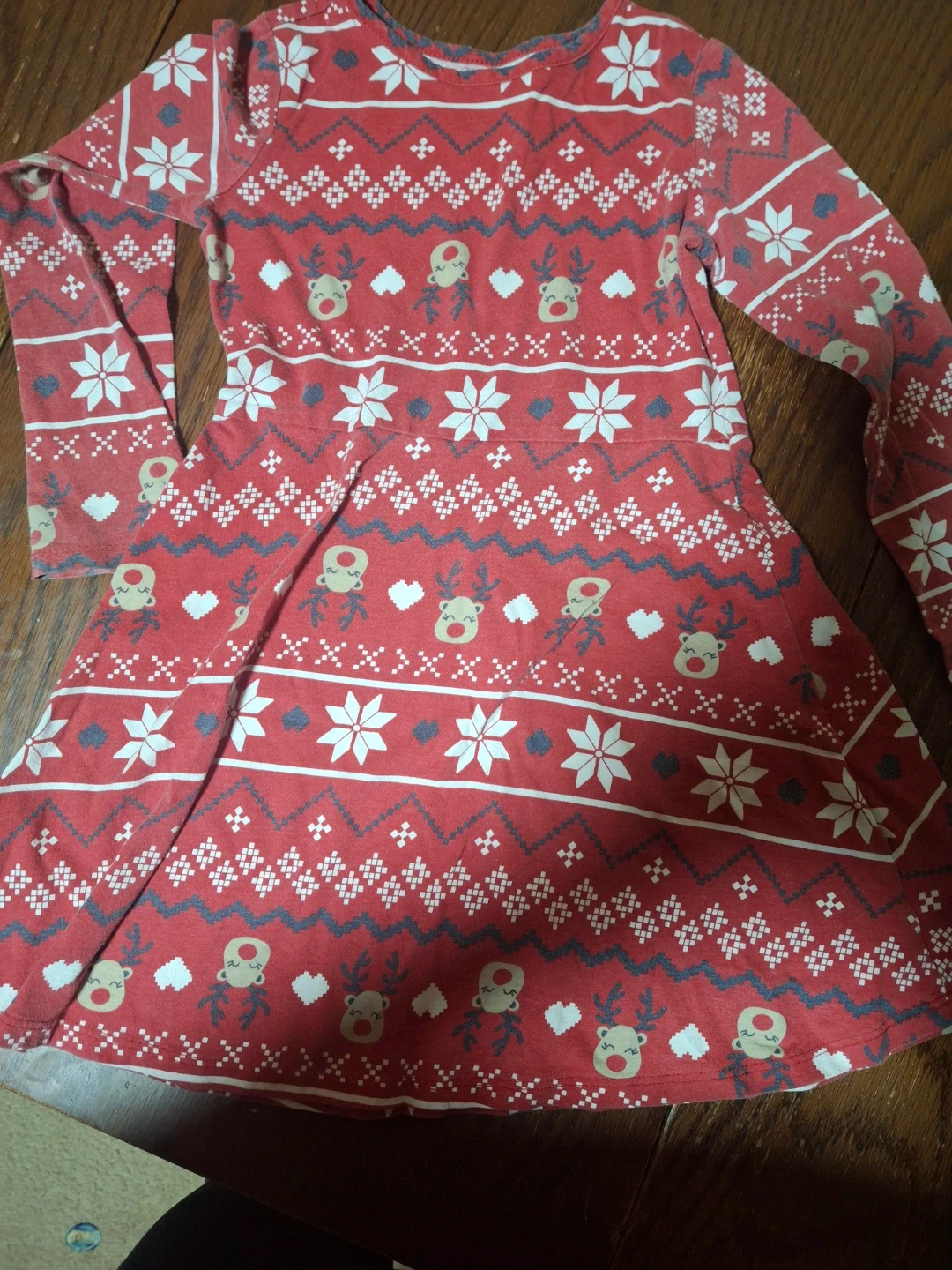 Long-sleeved red dress with a festive print of reindeer, snowflakes, and hearts. It's perfect for holiday events or casual wear during the winter season! Size 6