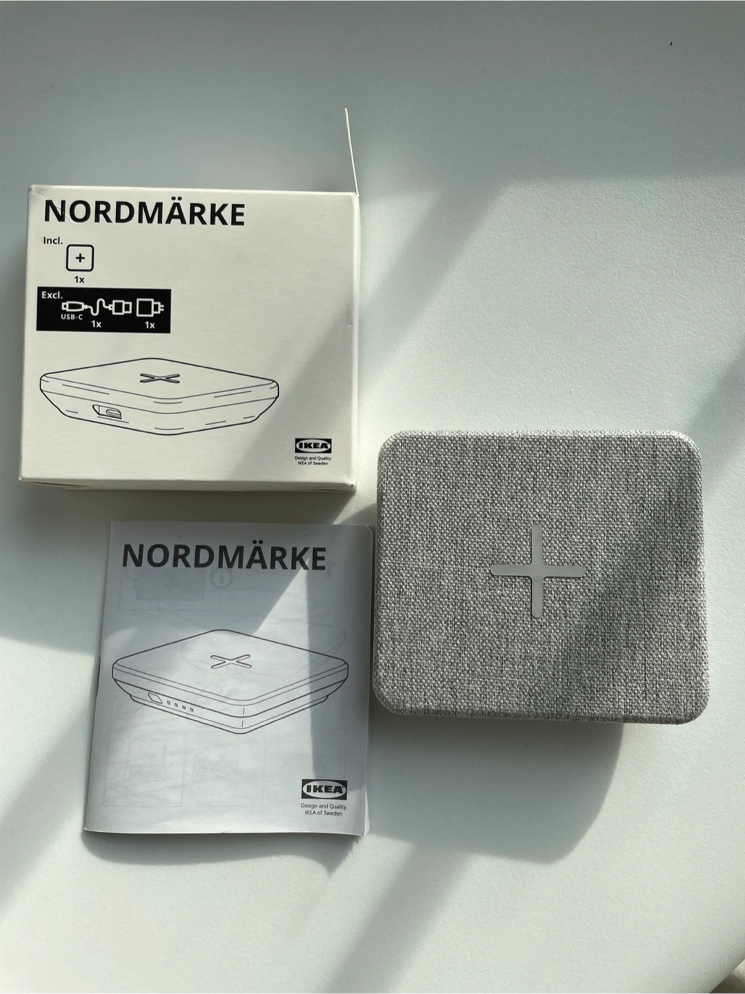This is an IKEA NORDMÄRKE wireless charger pad in grey. It's made of textile material and comes with instructions. A USB-C cable and power adapter are excluded.