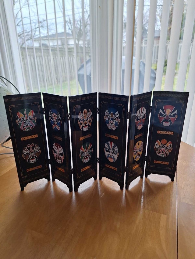 Beautiful tabletop folding Chinese Opera screen. Adding vibrant colour to any space. Includes gift box. 6-Panel Traditional Chinese Art for Home Decoration Desk Decor Mini Divider. Size: 48cm x 24cm x 0.6cm (Approx.). Asking $10 cash. Curbside pickup in south Ajax. Smoke-free home.