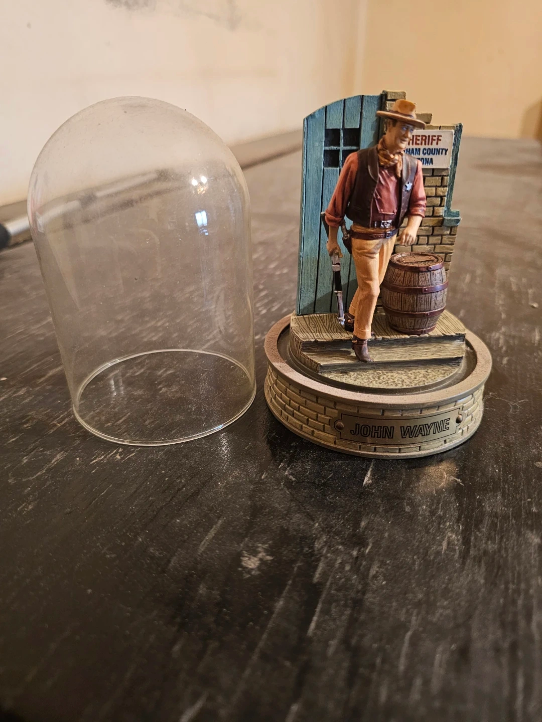 This is a collectible figurine featuring John Wayne as the Sheriff of Graham County, Arizona. The detailed piece includes a sheriff's badge, sheriff's office facade, and a barrel. It's housed under a clear glass dome.