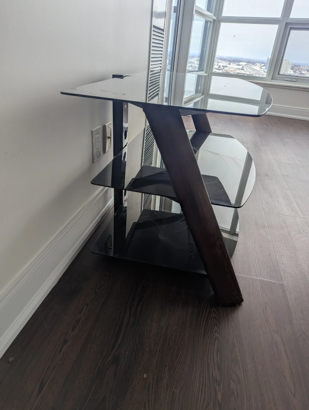 This 3-tier TV stand offers ample space for your media components. It features a black glass construction with unique wood accent supports. Its modern design complements various living room décors.
