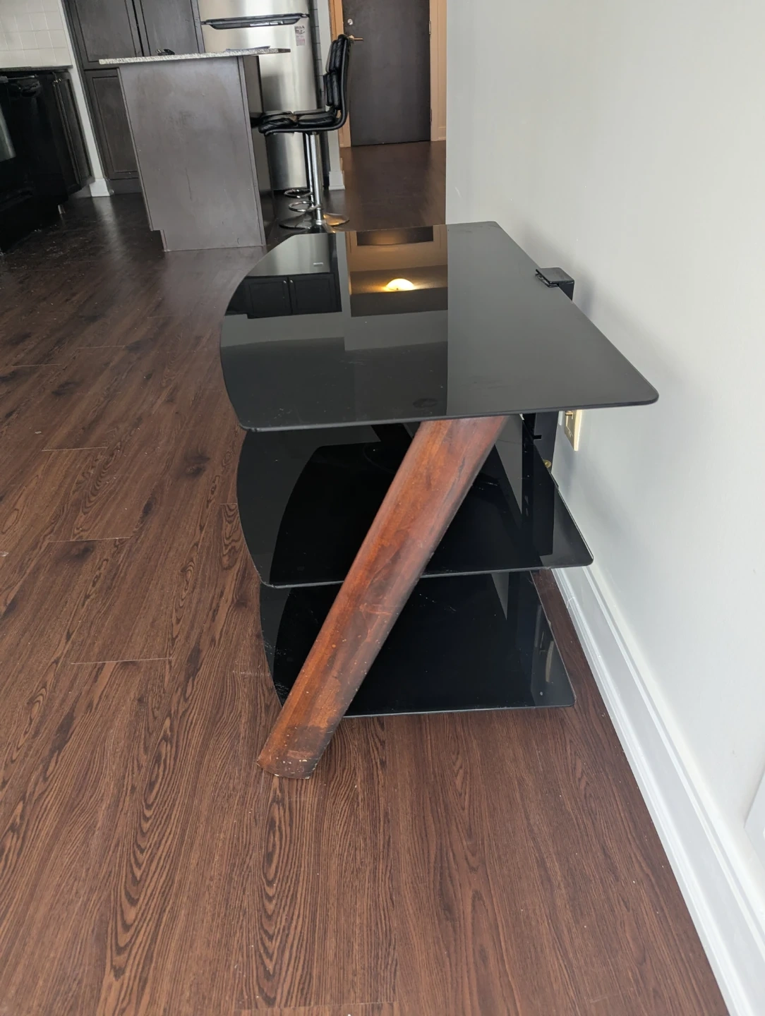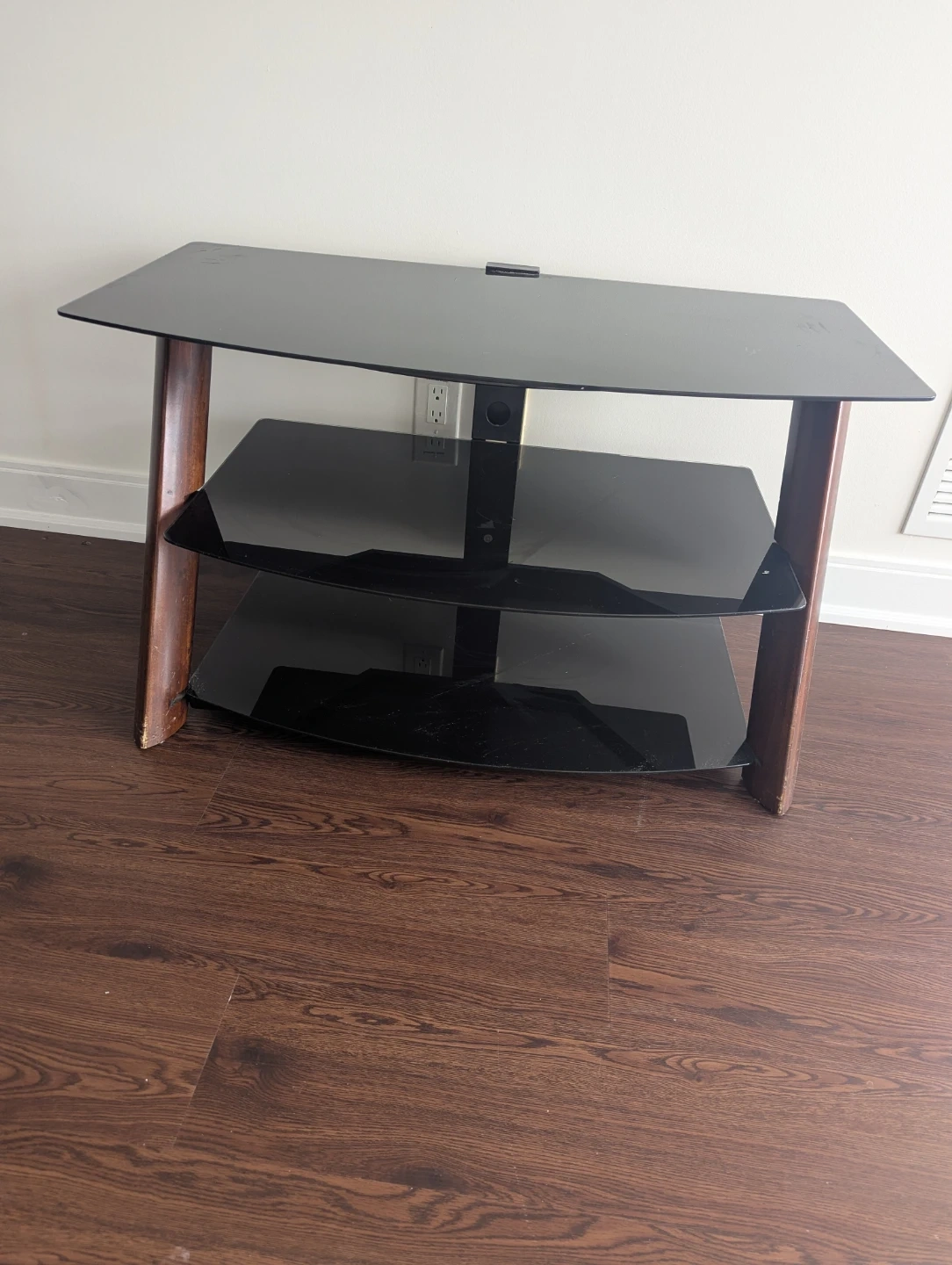 This 3-tier TV stand offers ample space for your media components. It features a black glass construction with unique wood accent supports. Its modern design complements various living room décors.