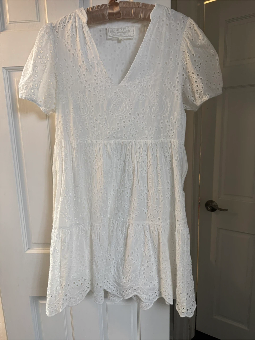 This is a beautiful 100% cotton white eyelet dress from Pink Martini. It's perfect for summer days or evenings out. The dress features a flattering V-neckline and short sleeves, with a tiered skirt. Side zipper. Fully lined. 35 ” from shoulder to hem. It's in great condition as it was only worn a few times. Smoke free, pet free home.