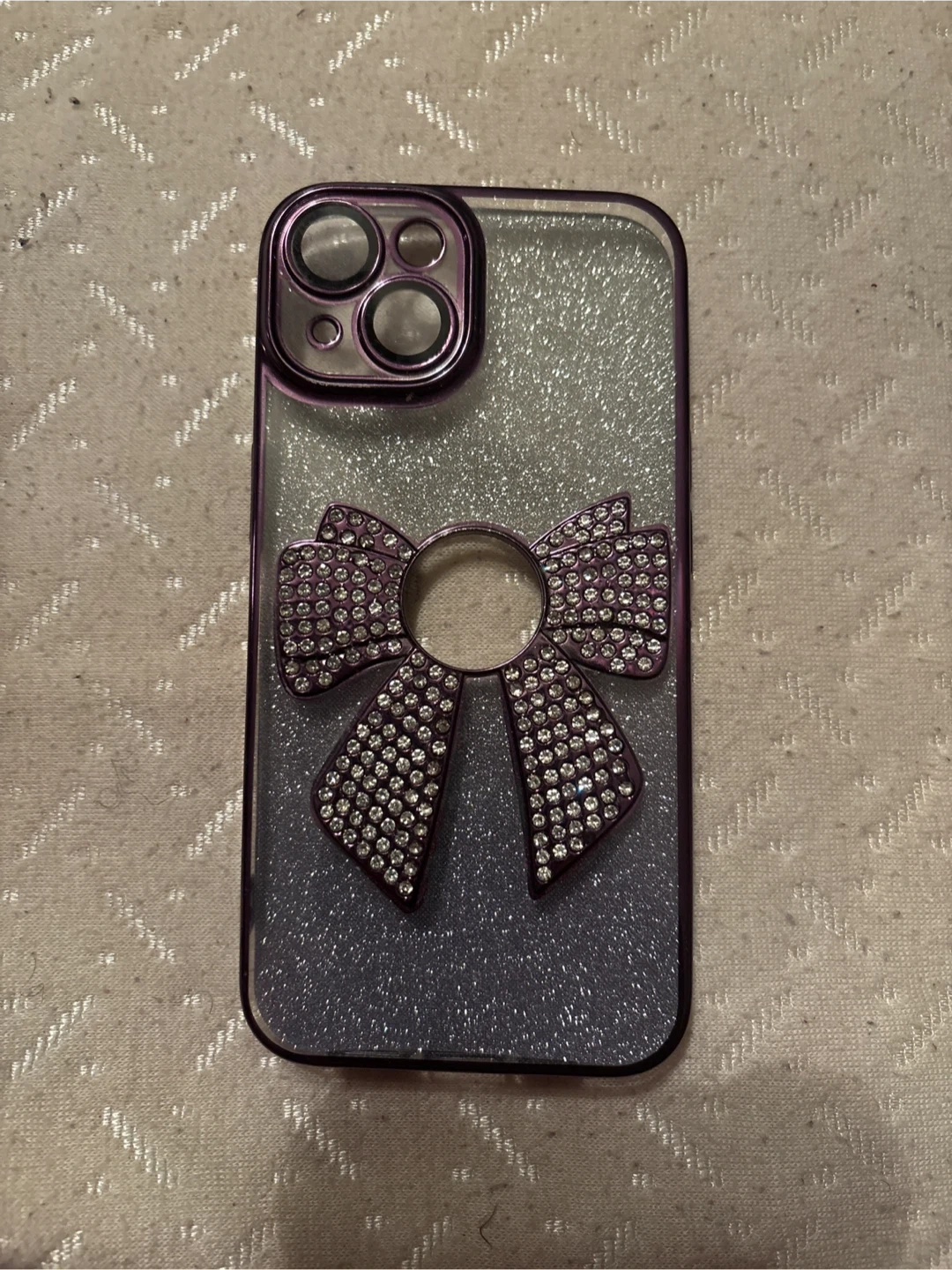 This phone case features a sparkly purple design with a rhinestone bow accent. It's designed for camera protection. Adds a fun and decorative touch to your device!