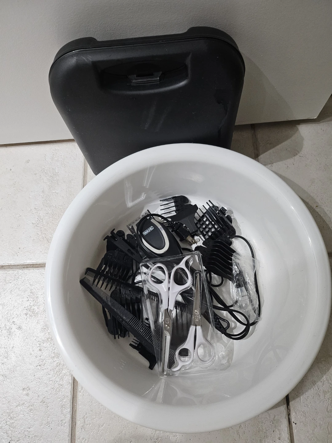 Selling a Wahl hair clipper set that includes various attachments, scissors, and a comb. Also comes with a black carrying case to keep everything organized!