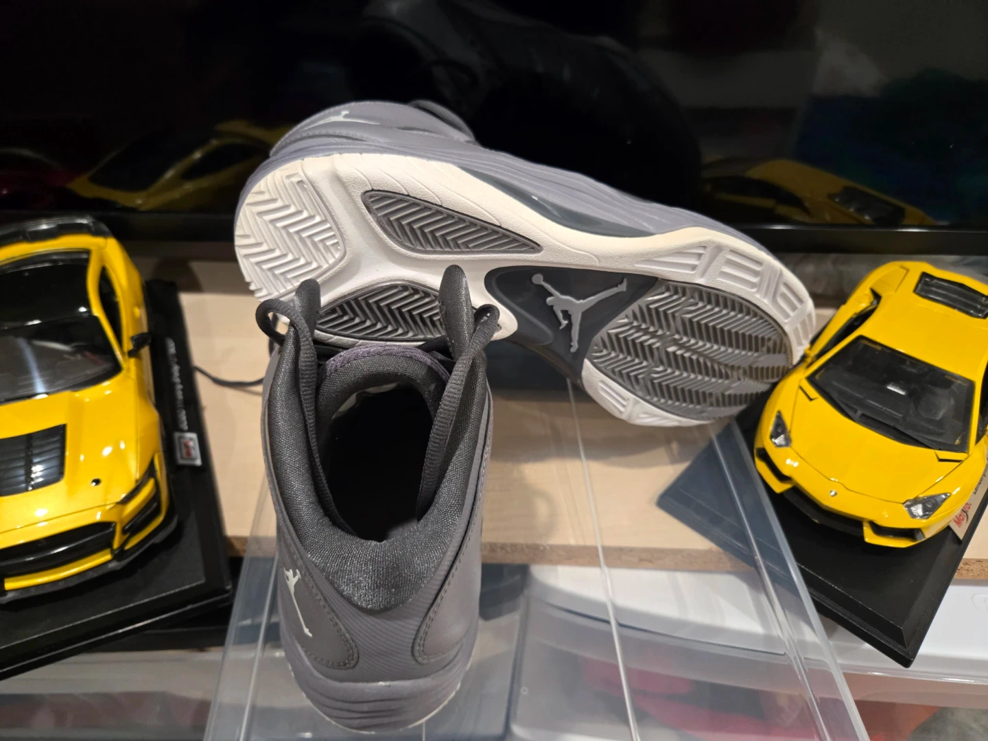 These are a pair of Nike Air Jordan men's basketball shoes in a size 11.5. They're a dark grey colour. This pair is ready for your next game!
