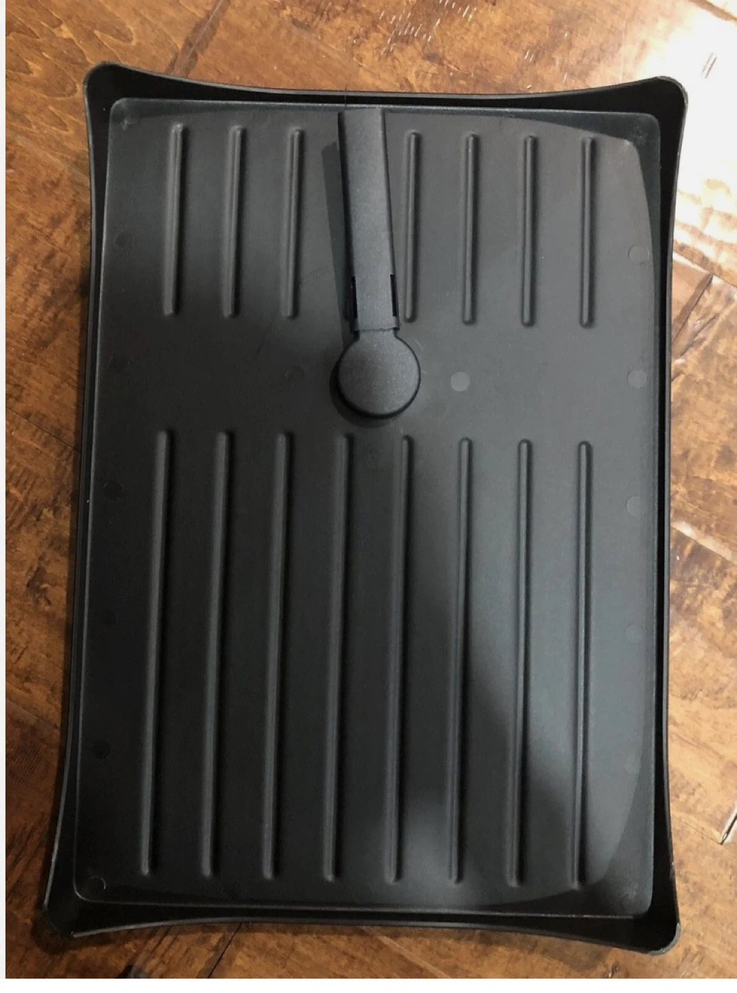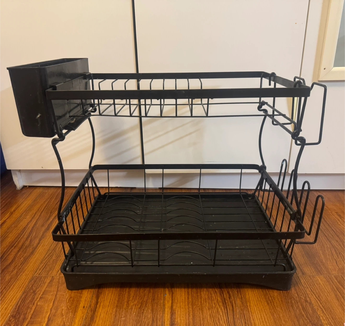 This two-tier dish rack is made of black metal and includes a removable utensil holder. It has a separate tray to catch water. It's perfect for drying dishes and cutlery.