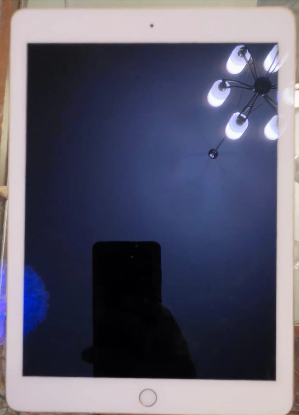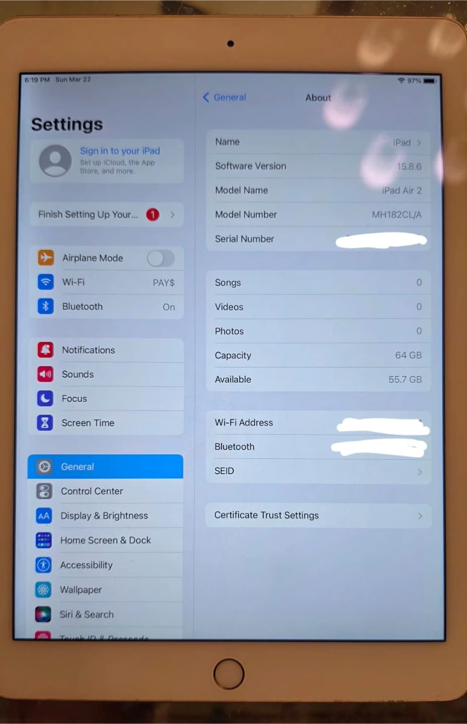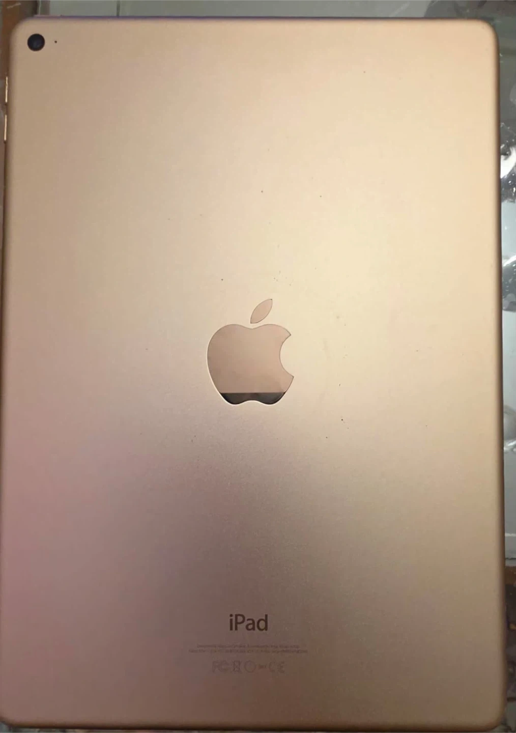 Gold iPad Air 2 with 64GB storage. Runs on iPadOS 15.8.6. This tablet's model number is MH182CL/A. Comes with charging adapter only.