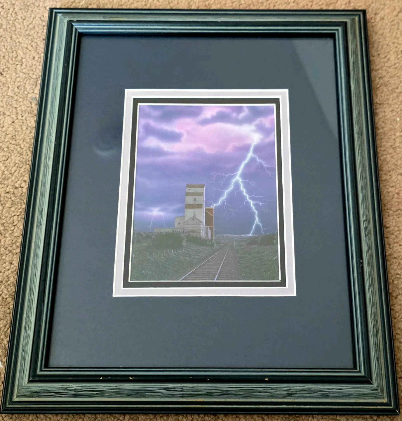 Framed art print titled "Prairie Sentinels" by Canadian artist Glen Scrimshaw. This piece depicts a lighthouse with a lightning strike in the background. Includes certificate of authenticity. Lithographed in Canada.