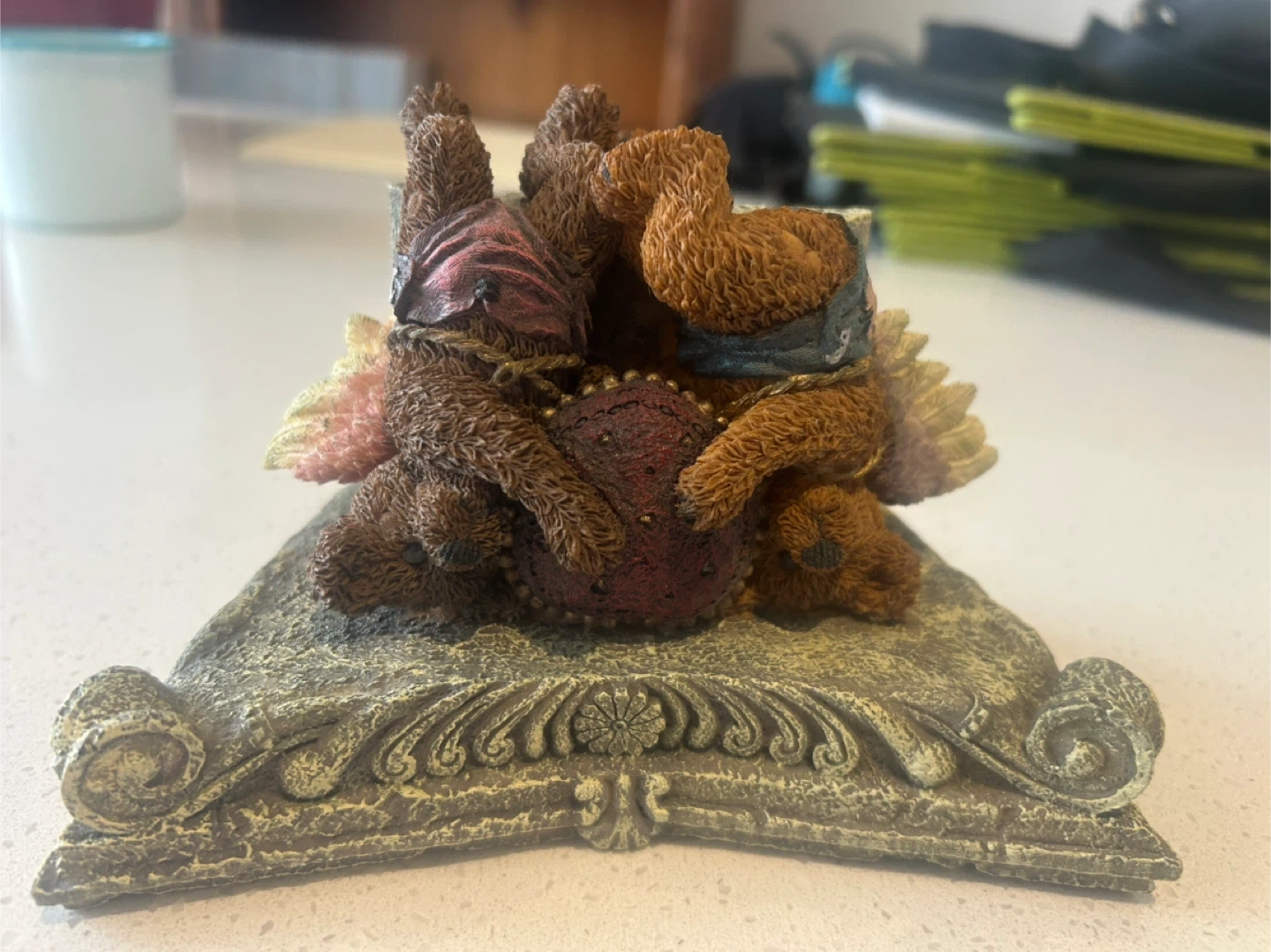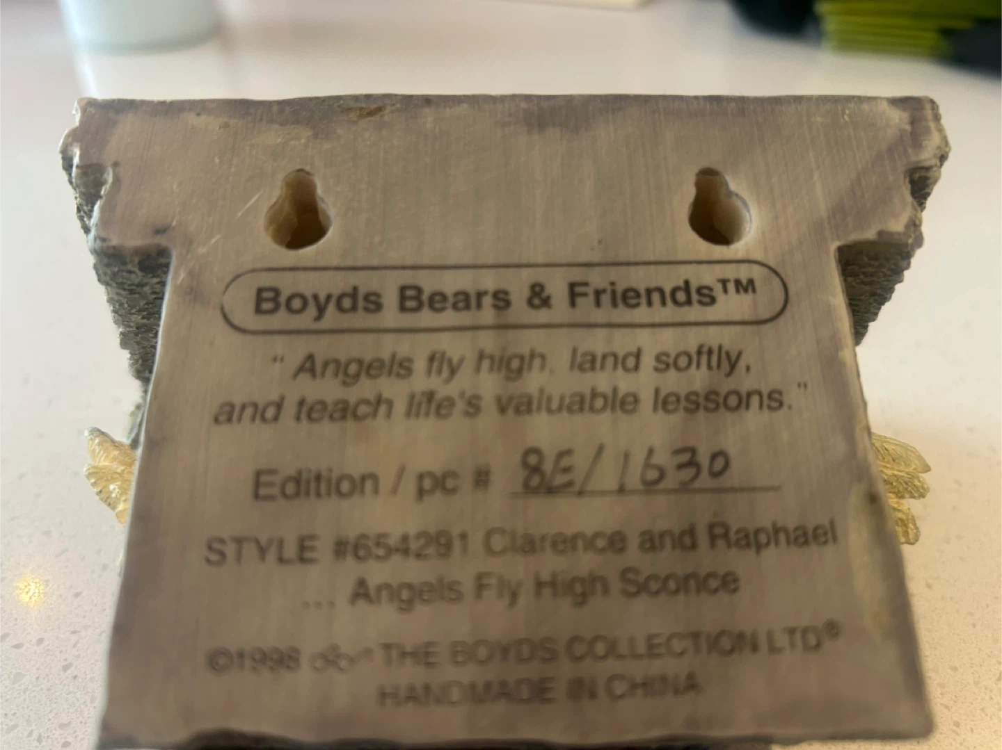 This Boyds Bears & Friends Sconce features Clarence and Raphael. It's from the 'Angels Fly High' collection, edition/pc # 8E/1630. This piece was handmade in China by The Boyds Collection Ltd. in 1998. It's a decorative item depicting two teddy bears with angel wings.