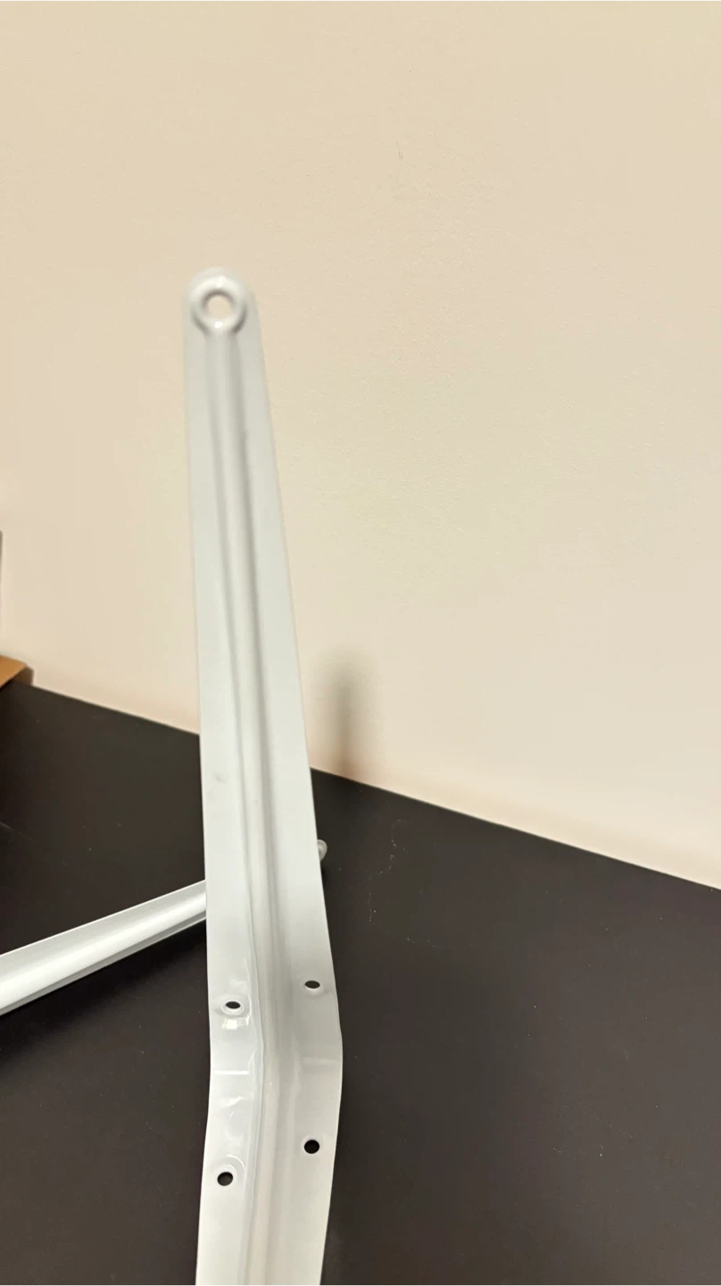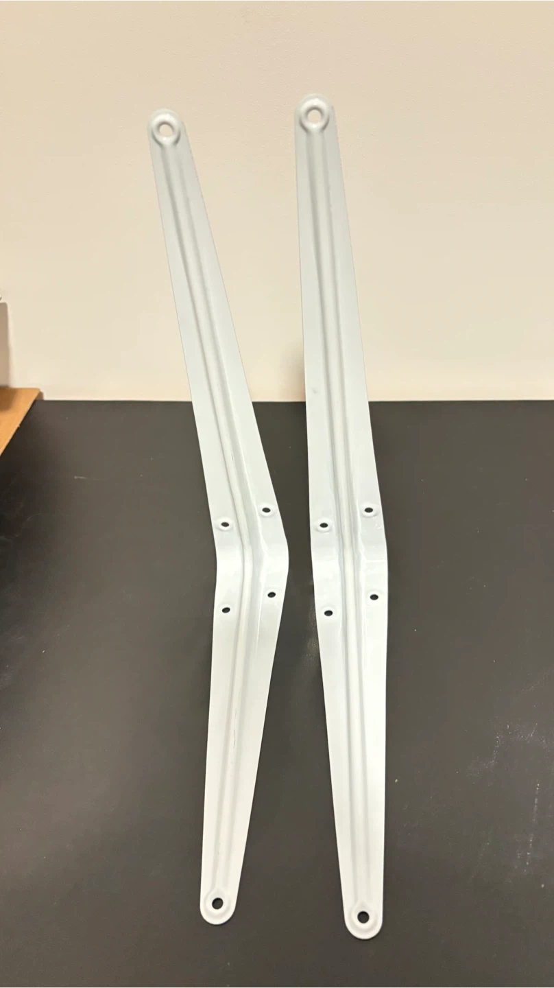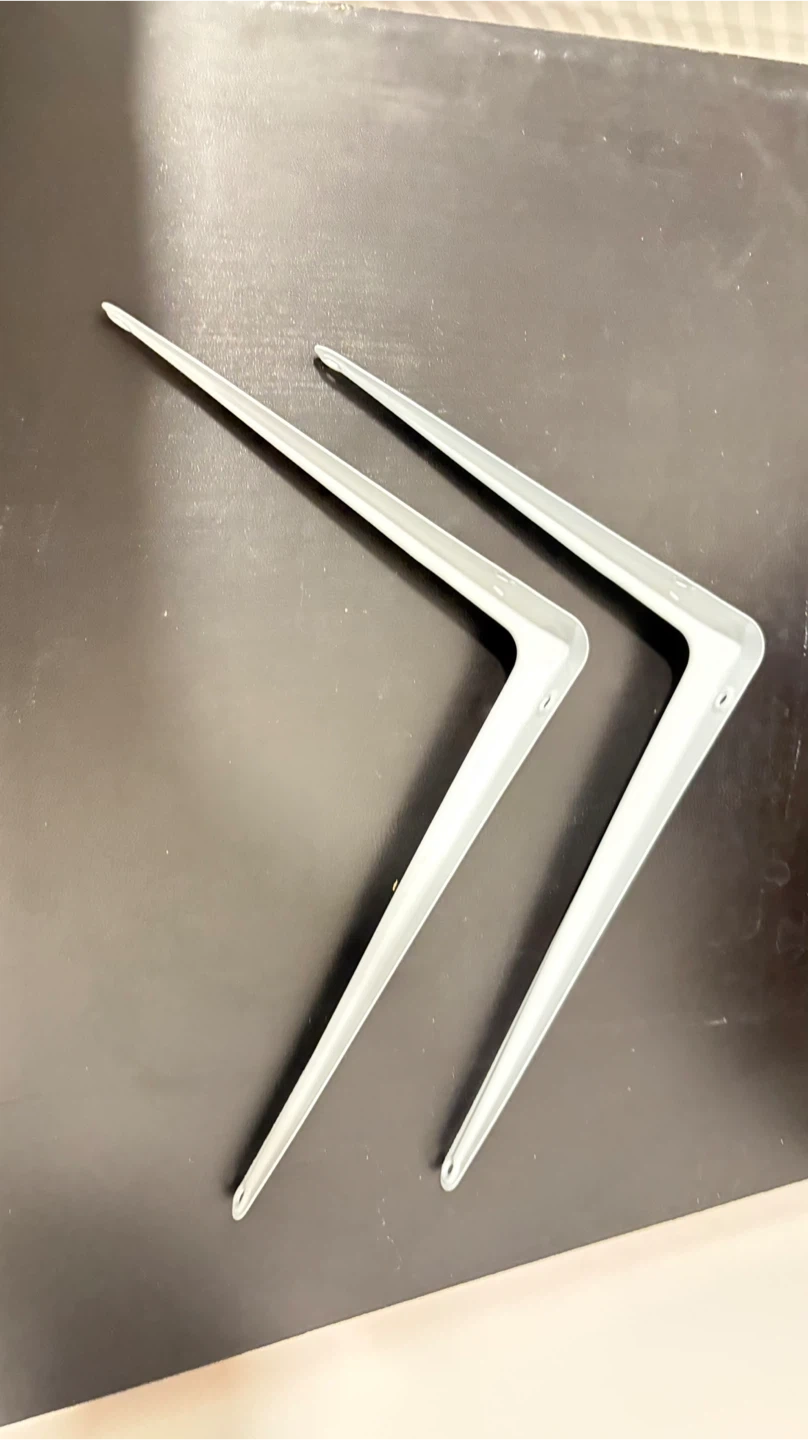 Selling a set of two white shelf brackets. These are sturdy and made of metal. They're suitable for holding shelves for storage or display.
