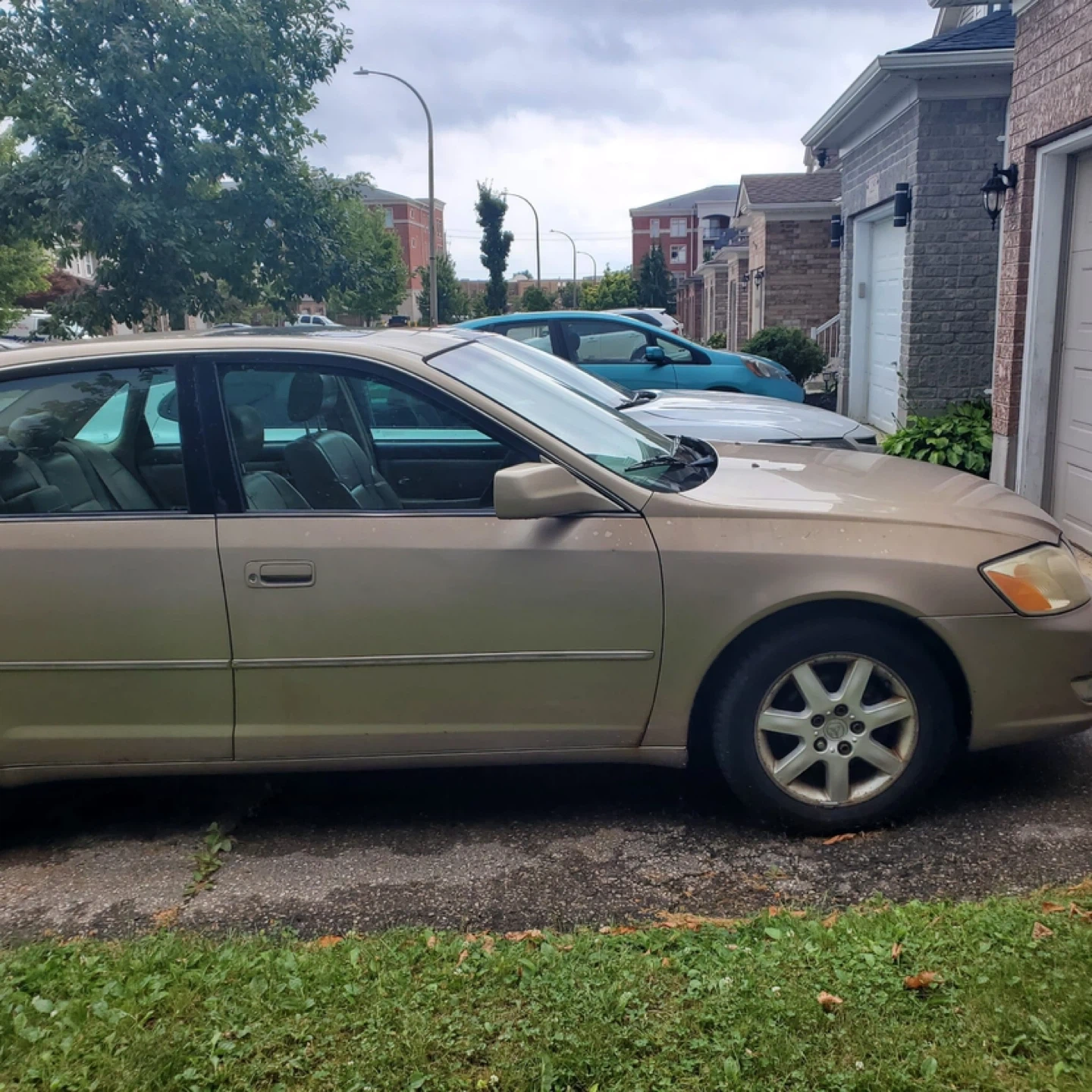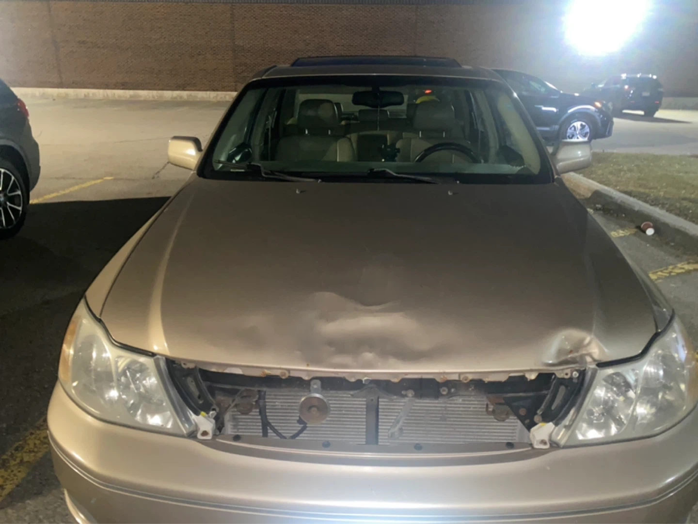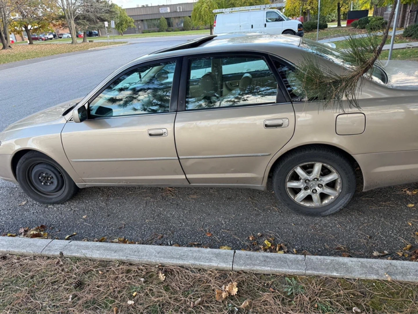 Gold sedan with tan interior. Has some front end damage and missing the front grille. Four doors and a sunroof. Has alloy wheels on the passenger side and a steel wheel on the driver's side front.