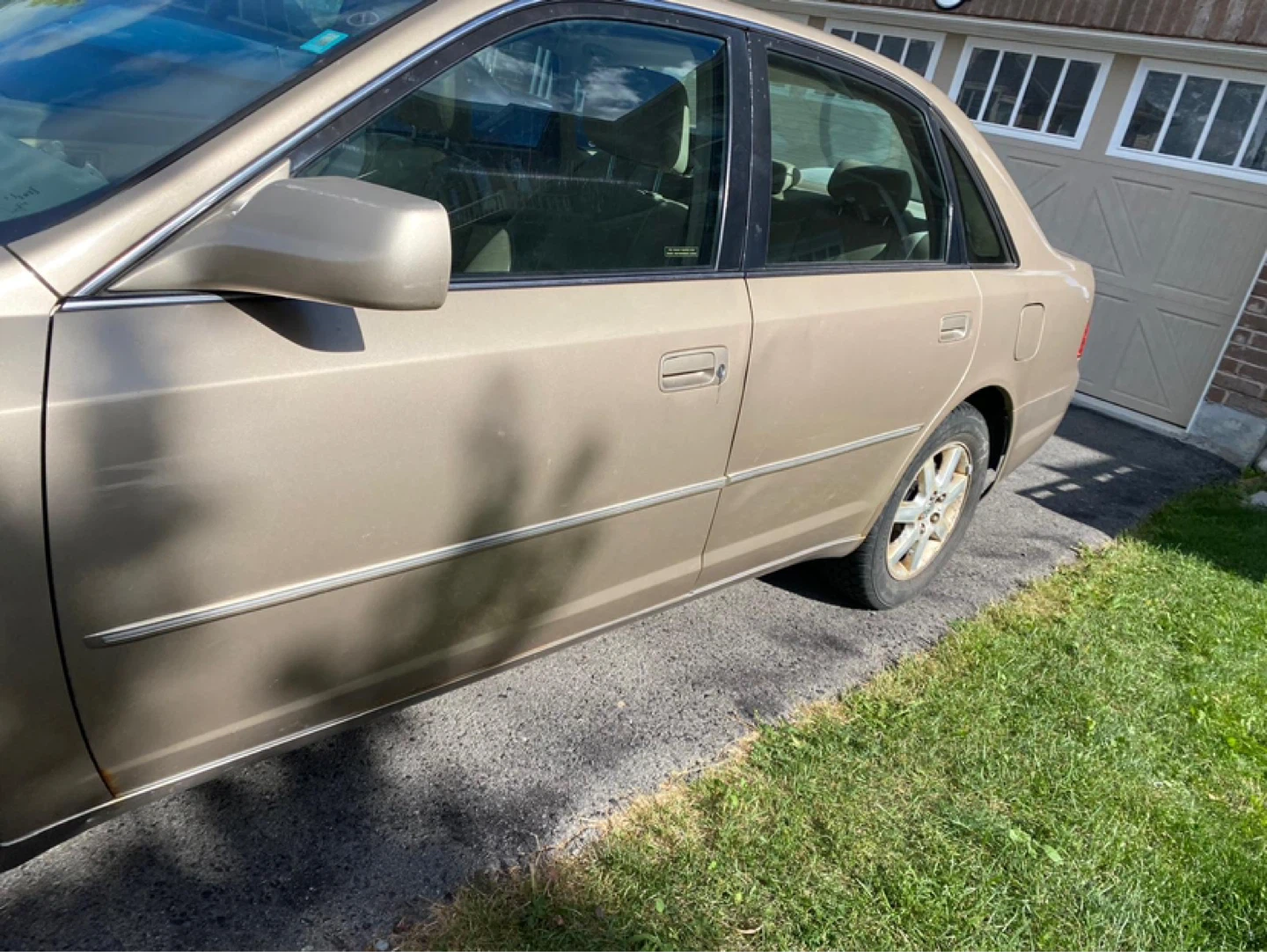 Gold sedan with tan interior. Has some front end damage and missing the front grille. Four doors and a sunroof. Has alloy wheels on the passenger side and a steel wheel on the driver's side front.