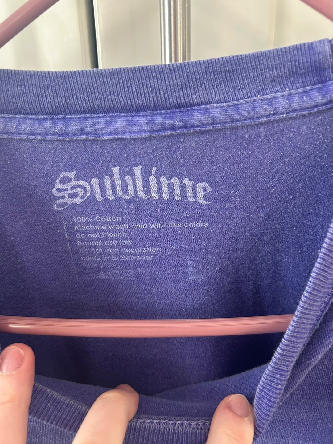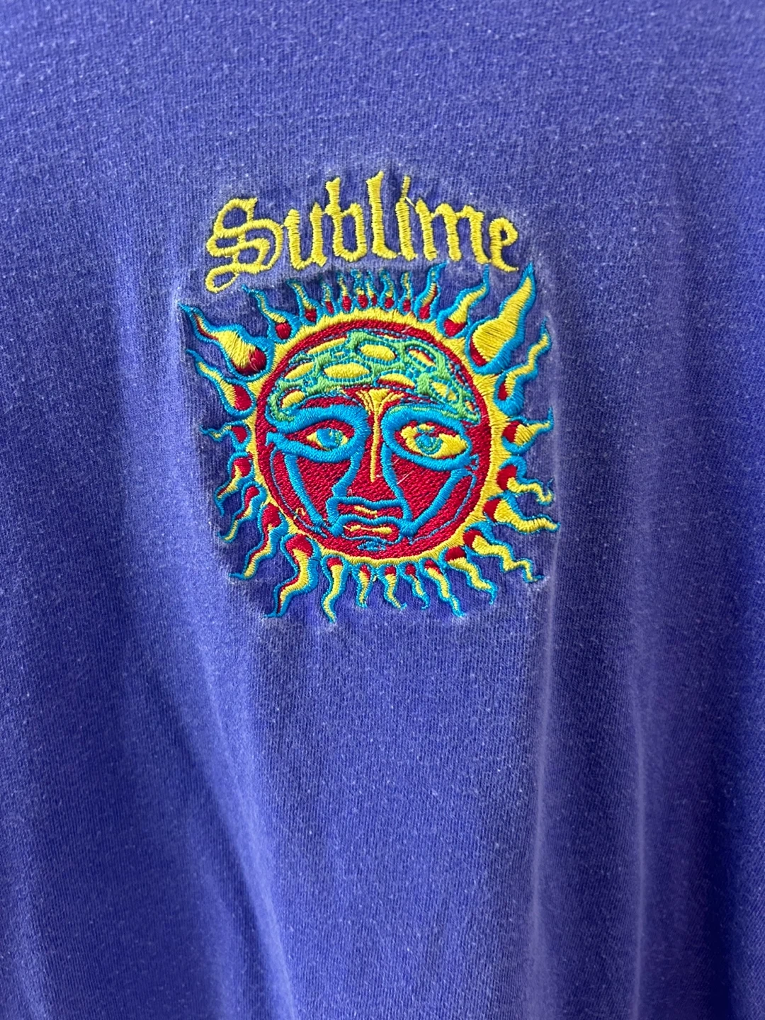 Purple long sleeve t-shirt with the iconic Sublime sun logo embroidered on the front. Made from 100% cotton. Machine wash cold with like colours. Tumble dry low. Do not iron decoration.