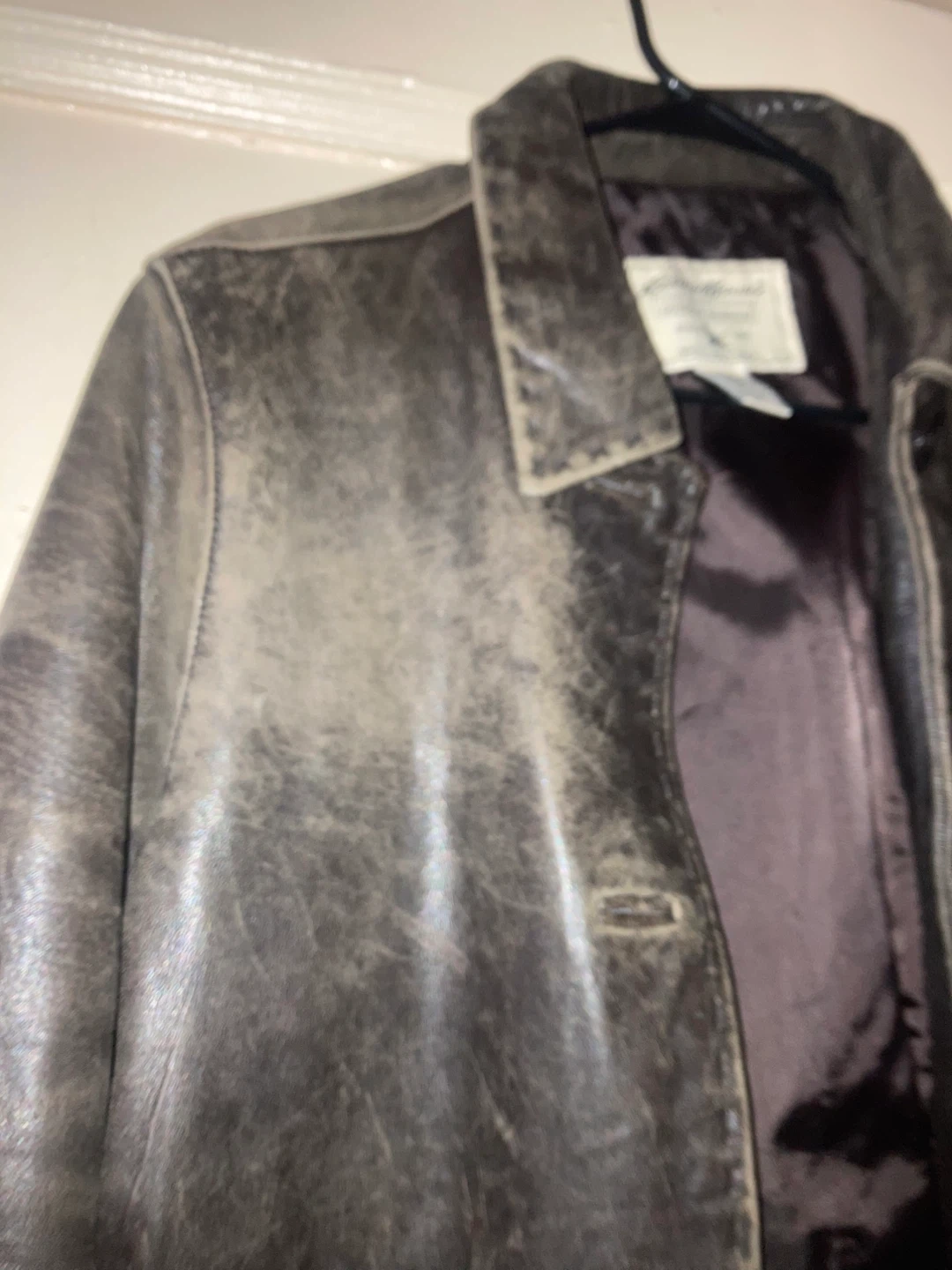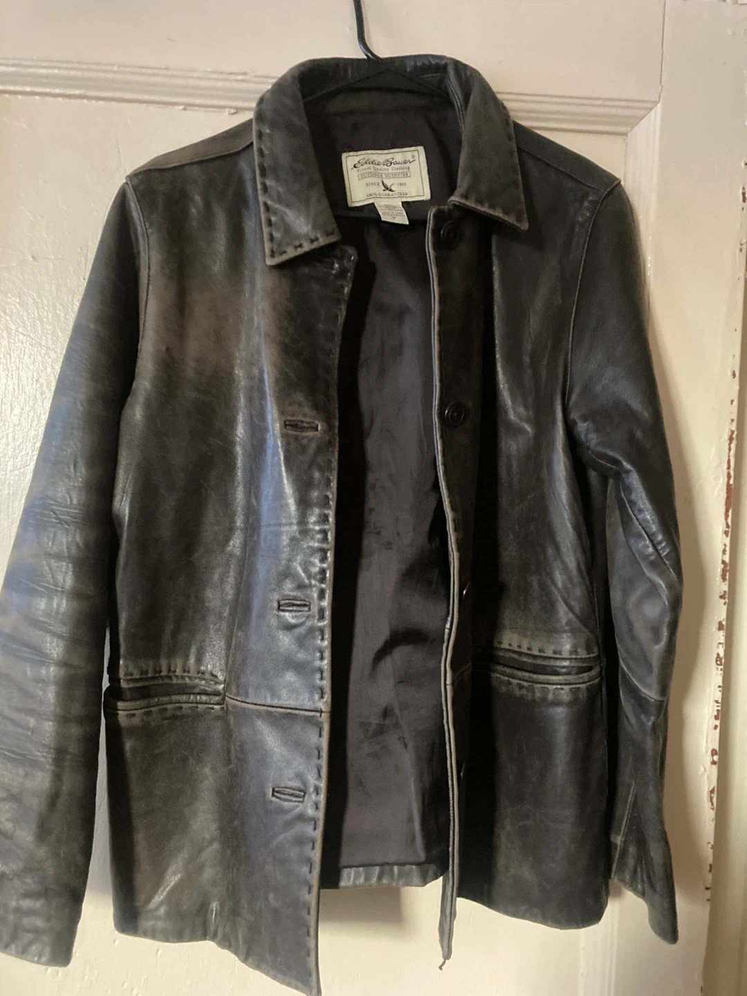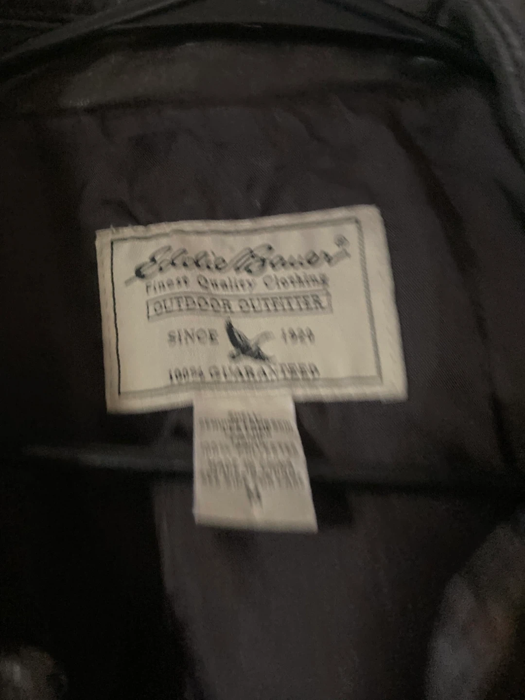 Selling a stylish Eddie Bauer lambskin leather jacket in size medium. It has a classic outdoor outfitter design and is made with 100% guaranteed quality. Perfect for adding a touch of ruggedness to your wardrobe!