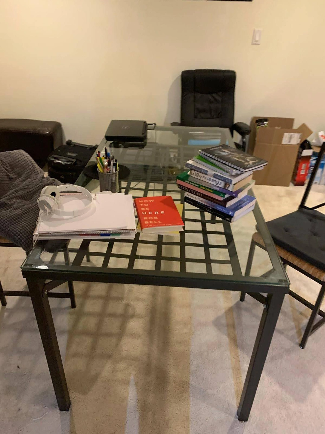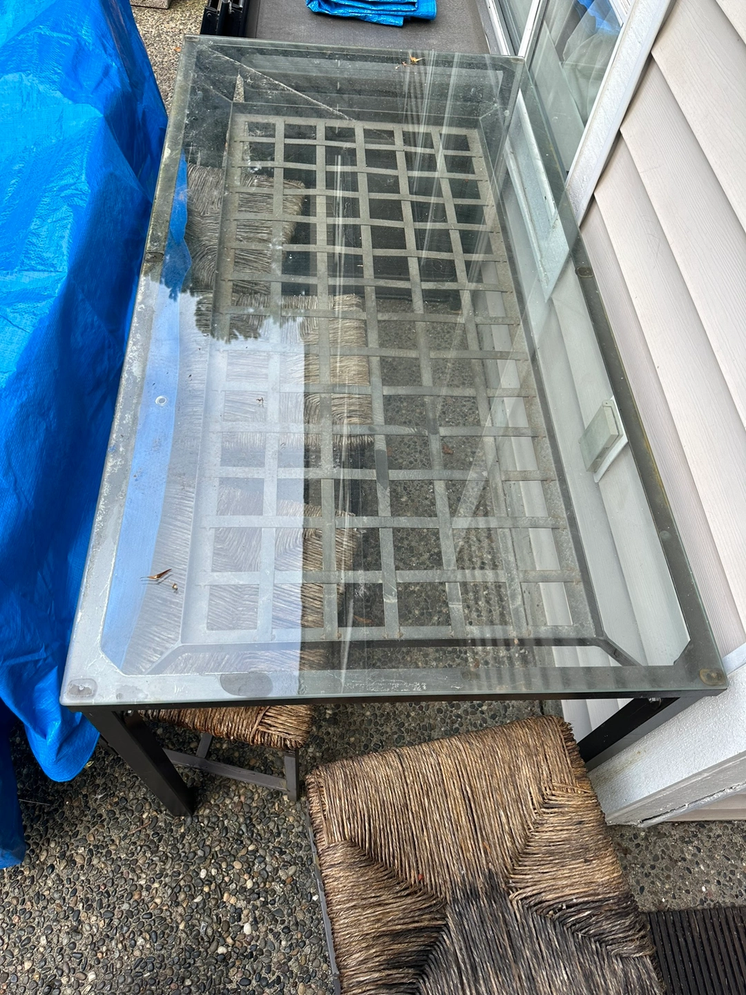 I am giving away an outdoor table and chairs set. The set includes 4 chairs and a rectangular table.