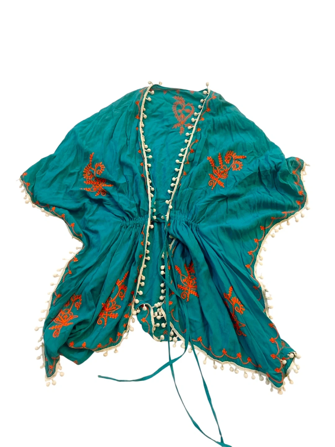 This teal kimono-style cover-up features orange embroidery and white pom pom trim. It has a drawstring waist for an adjustable fit. It's made from a lightweight fabric, perfect for beachwear or as a stylish layering piece.