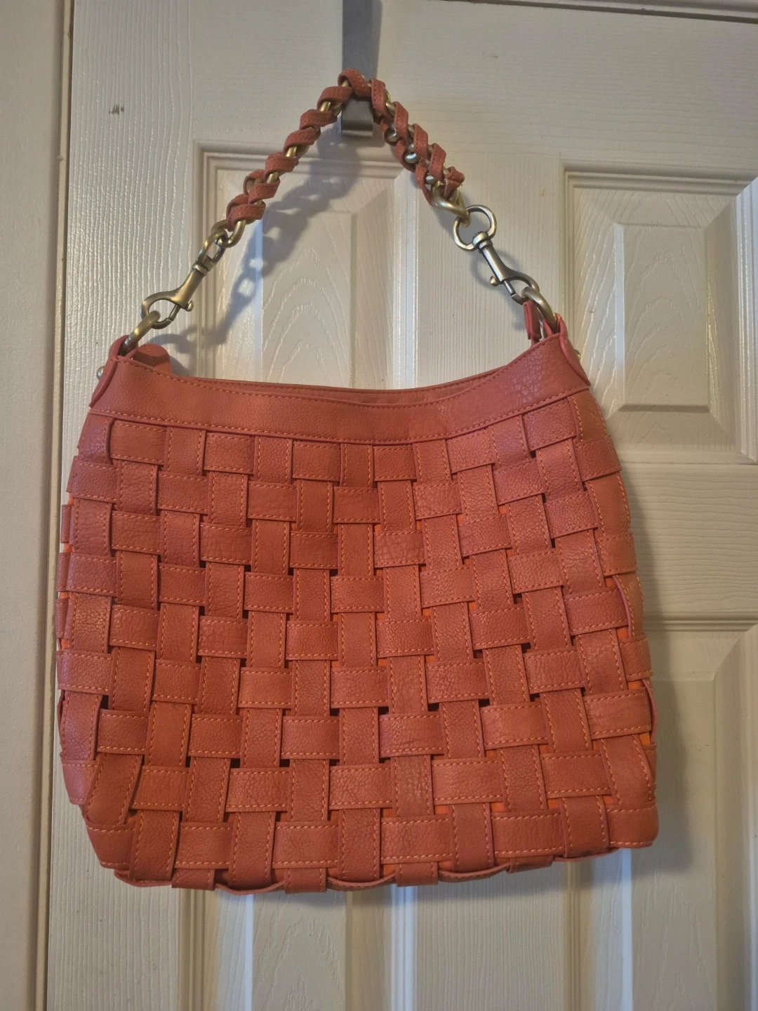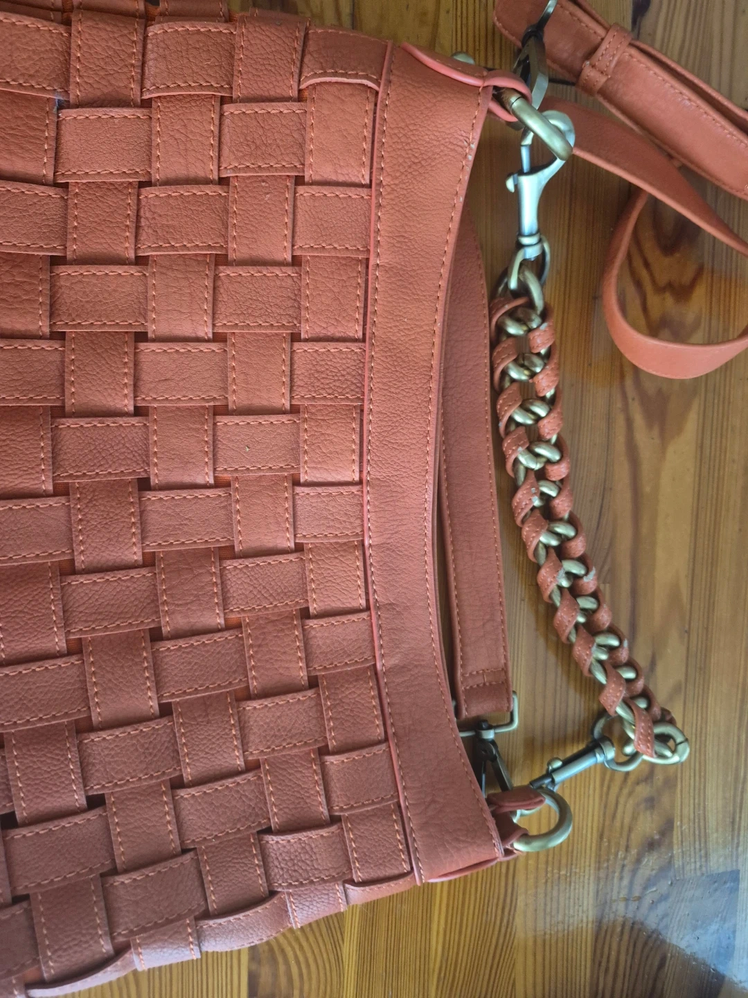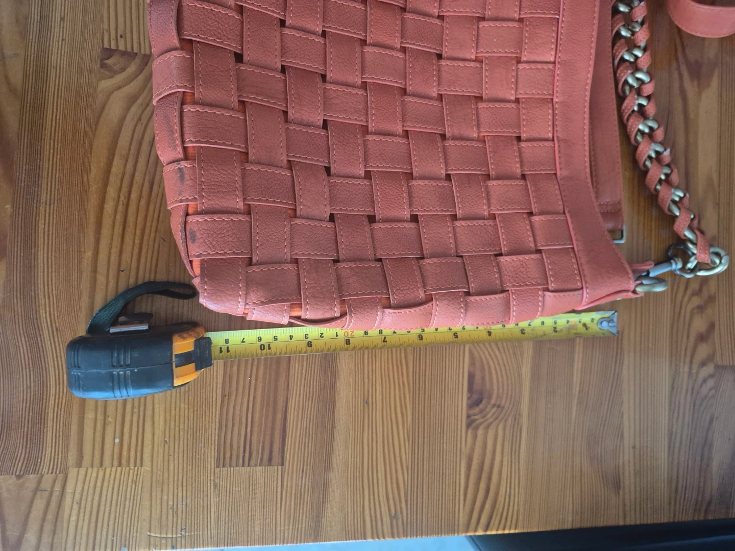 Stylish orange shoulder bag with a woven faux leather exterior. It has a braided strap detail and gold-tone hardware. Measurements are approximately 13 inches wide and 10 inches tall.