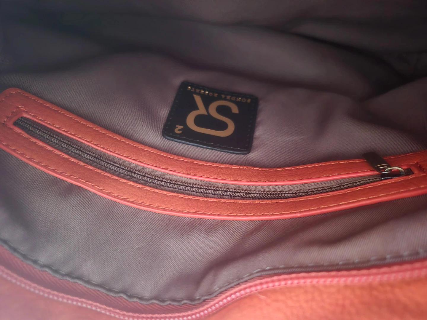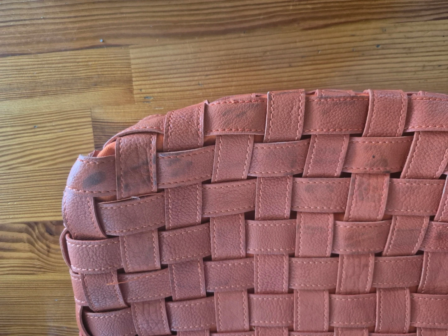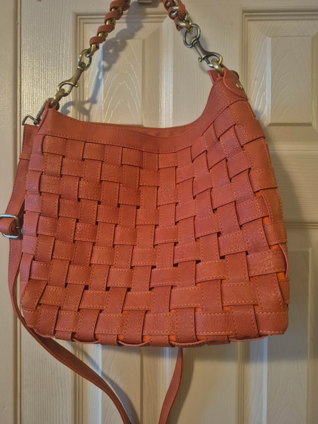 Stylish orange shoulder bag with a woven faux leather exterior. It has a braided strap detail and gold-tone hardware. Measurements are approximately 13 inches wide and 10 inches tall.