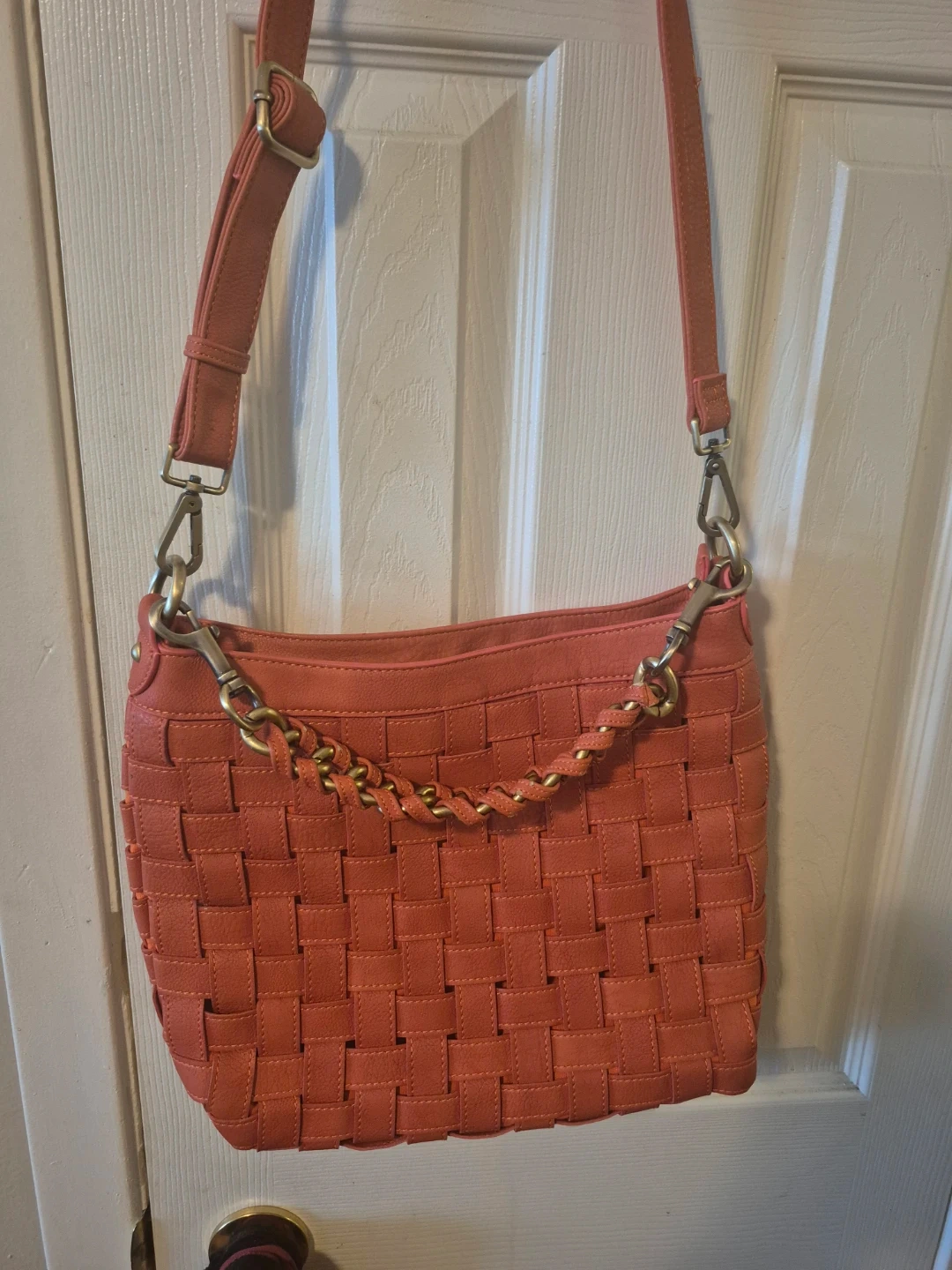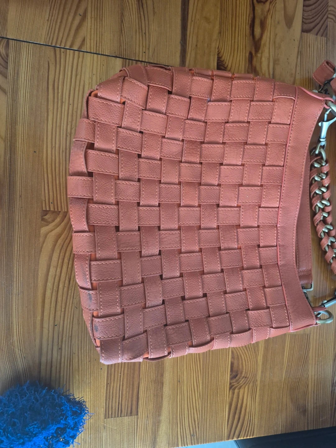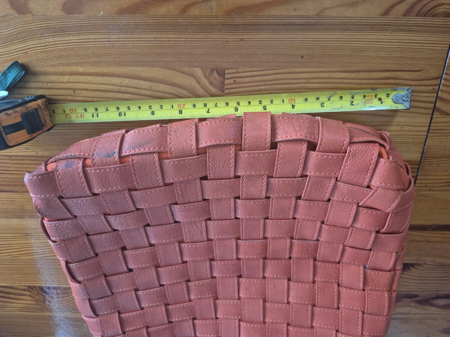 Stylish orange shoulder bag with a woven faux leather exterior. It has a braided strap detail and gold-tone hardware. Measurements are approximately 13 inches wide and 10 inches tall.