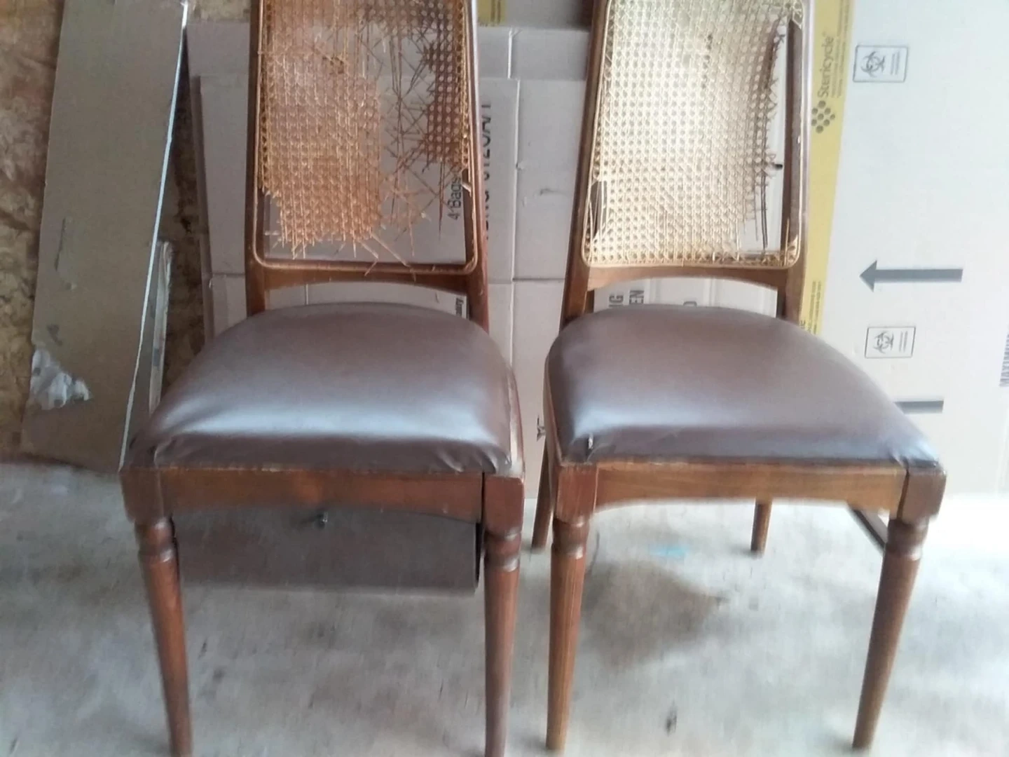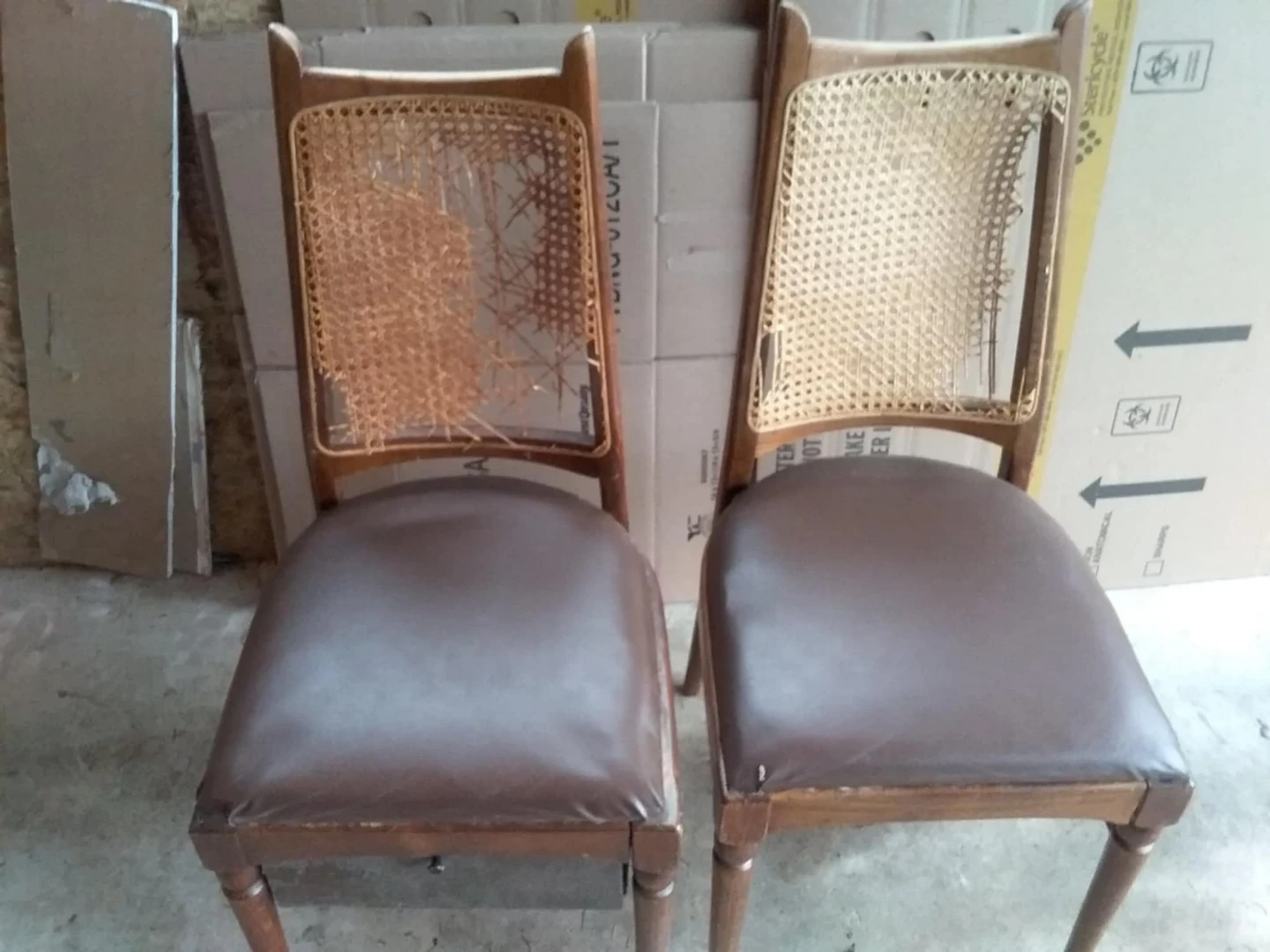 Set of four vintage dining chairs with wooden frames and brown faux leather seats. Both chairs have cane backs, one with minor wear and the other with significant damage. They're great for a dining room or kitchen seating. I would replace cane backs on all four. Two have linen drawers that hang under neath