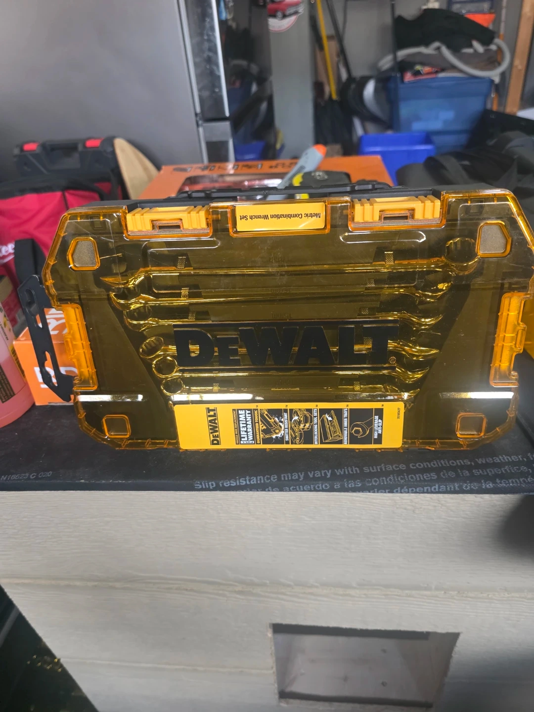 Metric combination wrench set in a clear DEWALT case. Includes lifetime warranty. Features shatter-resistant, high-leverage, anti-slip design. Great for mechanics!