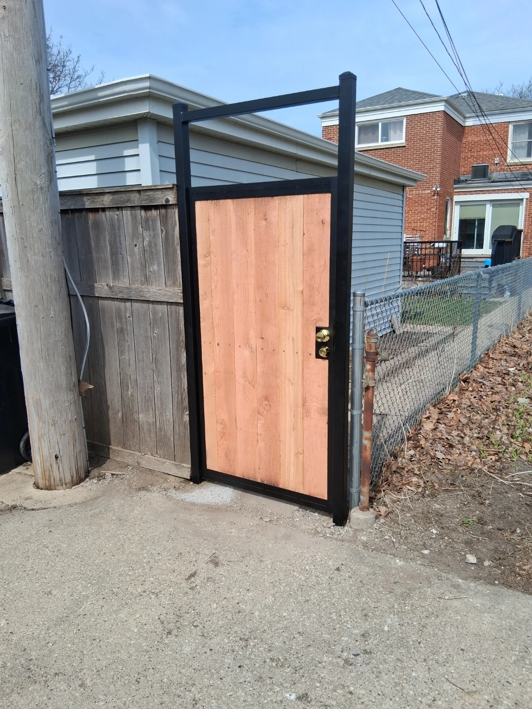 Sturdy double driveway gate with a beautiful wood plank design framed in metal. It features a diamond pattern in the center and a gold-tone handle. This gate is built for durability and security. Excellent for enhancing your property's curb appeal and privacy!