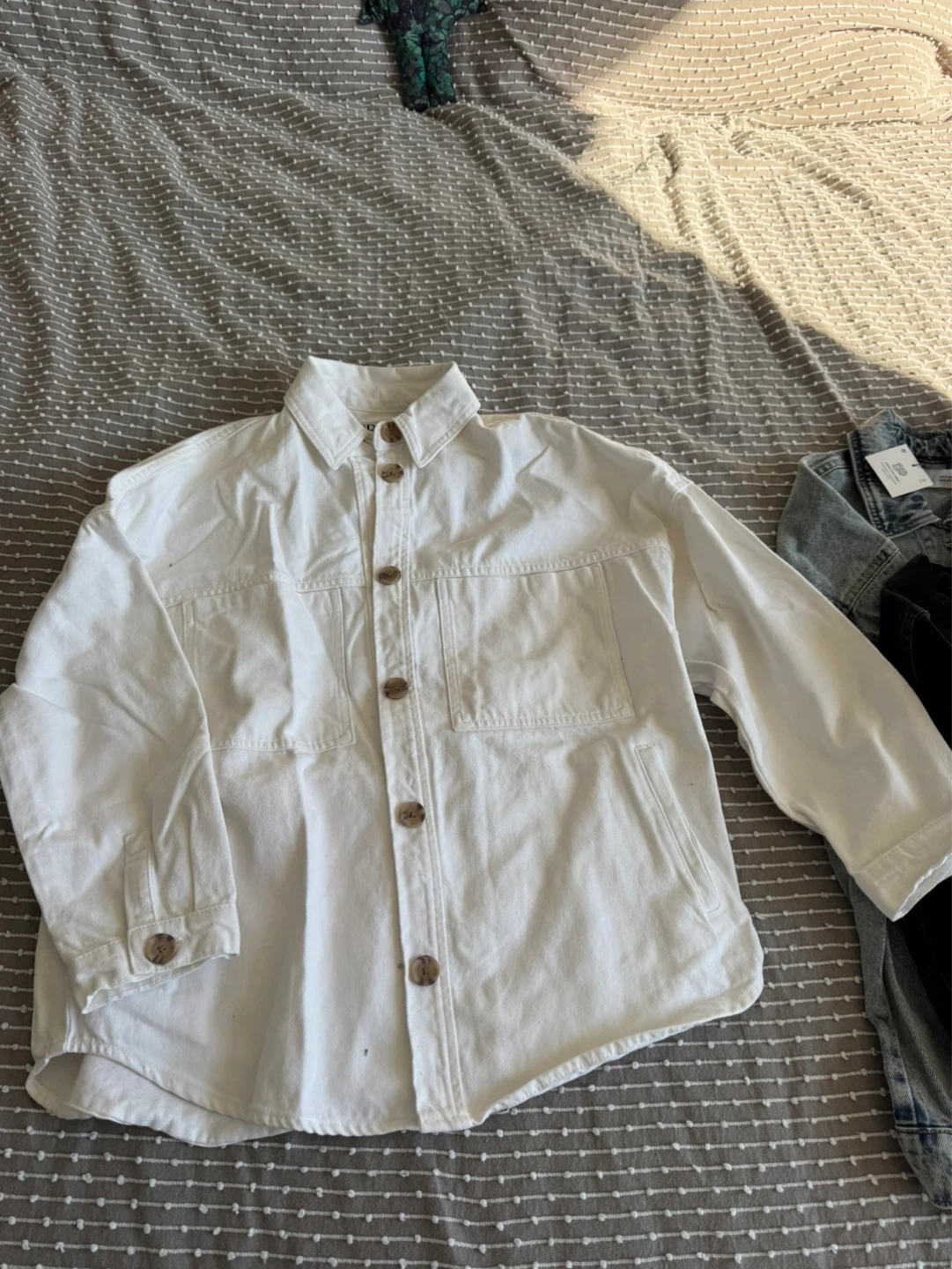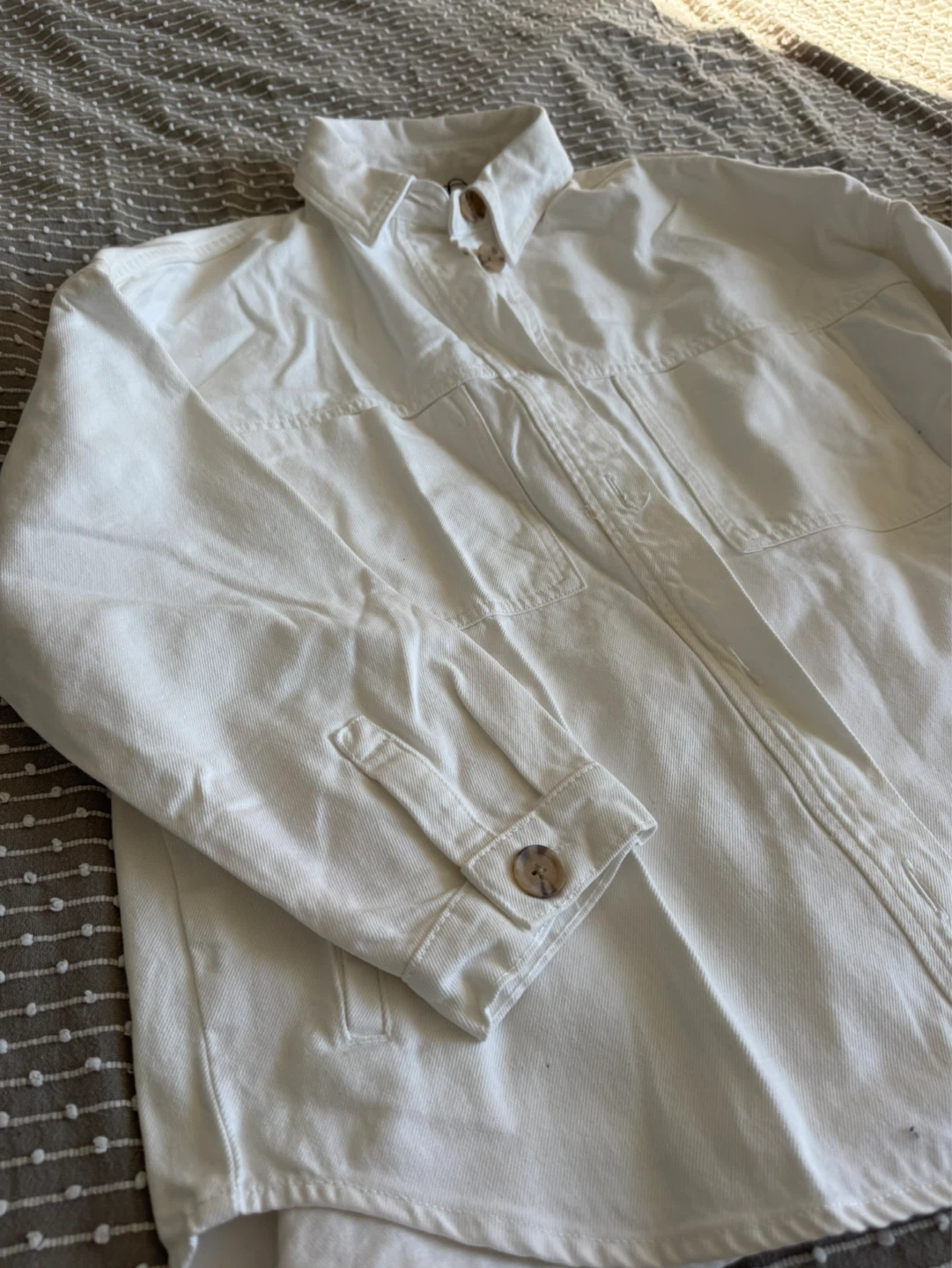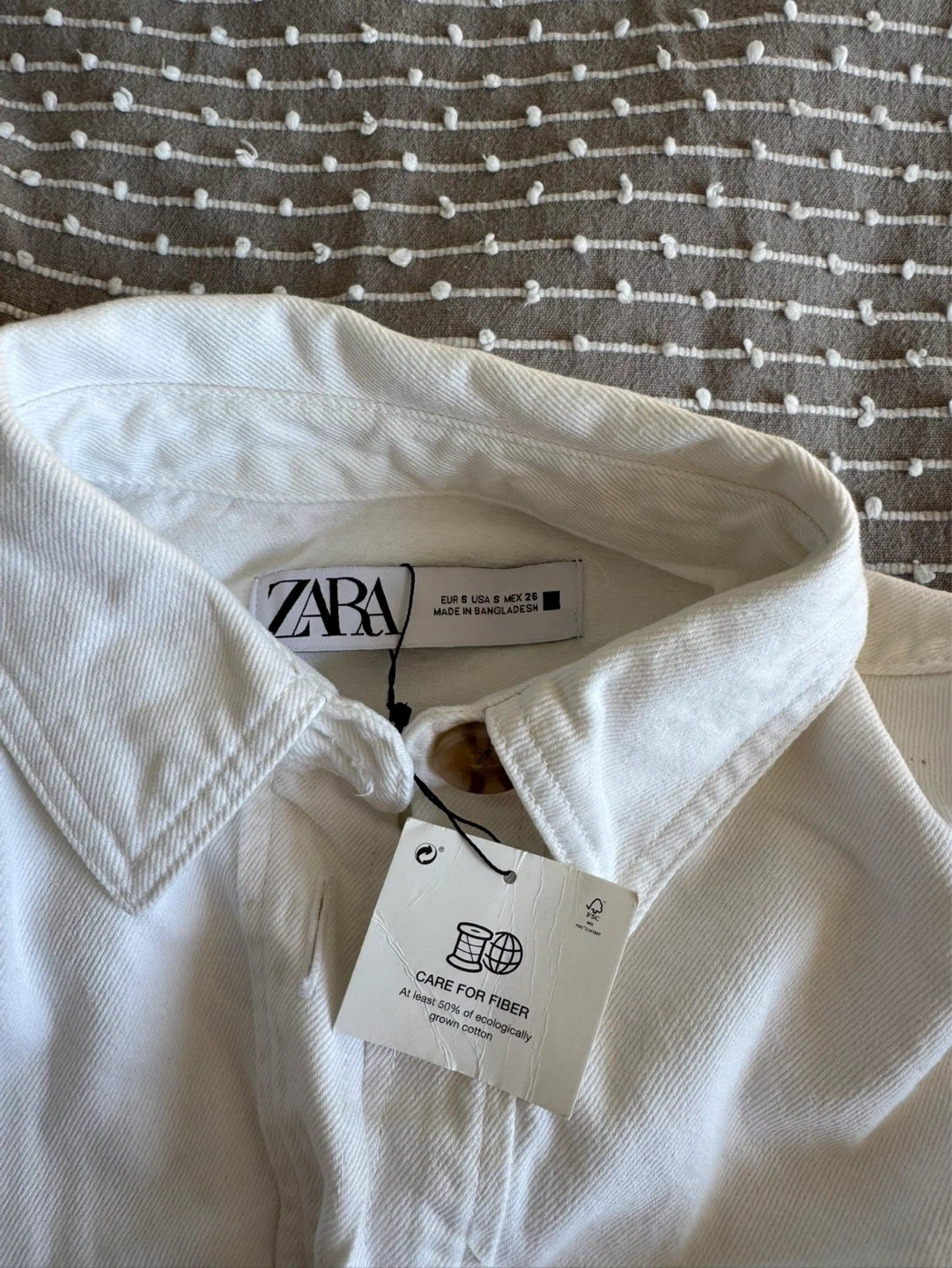 White ZARA jacket. Size S. Made with at least 90% ecologically grown cotton. Button closure and cuffs. 4 pockets. New. Never worn. Bought for a project but didn’t use. This is a roomy fit.