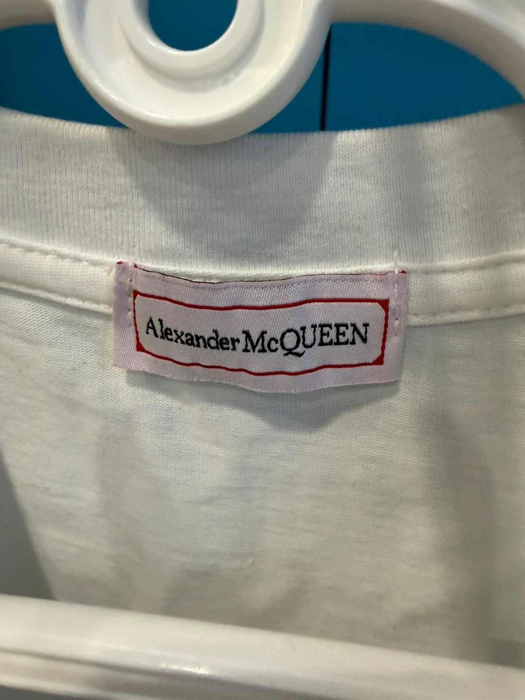 Selling a stylish Alexander McQueen white graphic tee! This tee features a unique design and is perfect for adding a touch of luxury to your casual wardrobe. It's in great condition and ready for a new owner! Slight discoloration on collar.