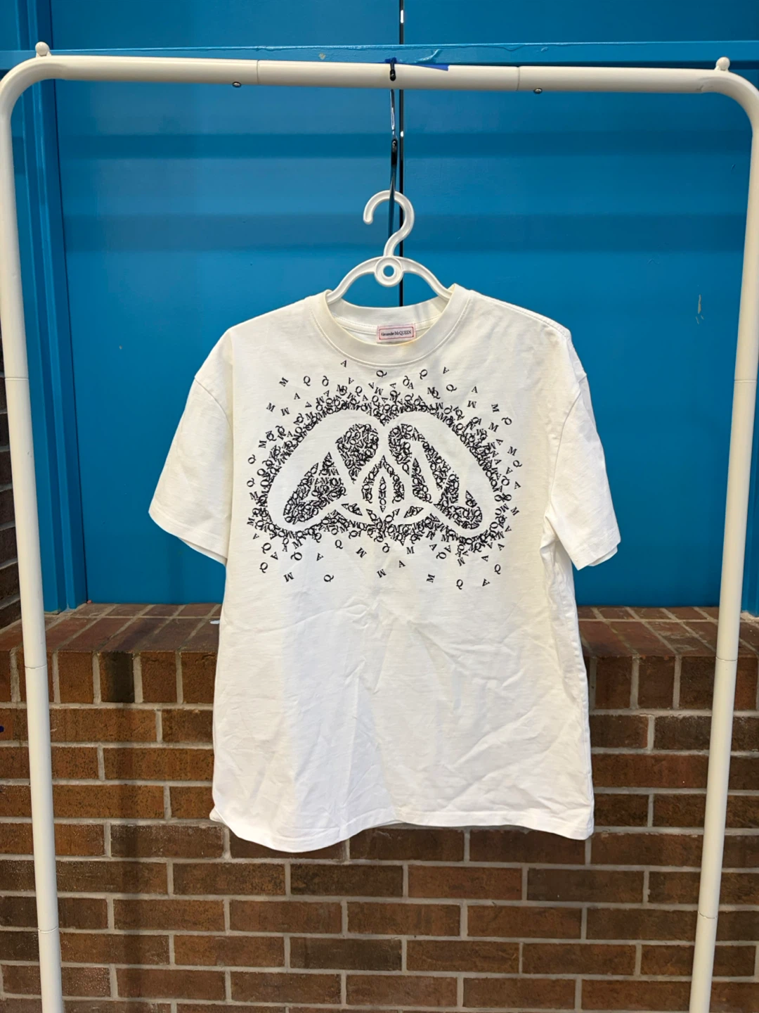 Selling a stylish Alexander McQueen white graphic tee! This tee features a unique design and is perfect for adding a touch of luxury to your casual wardrobe. It's in great condition and ready for a new owner! Slight discoloration on collar.