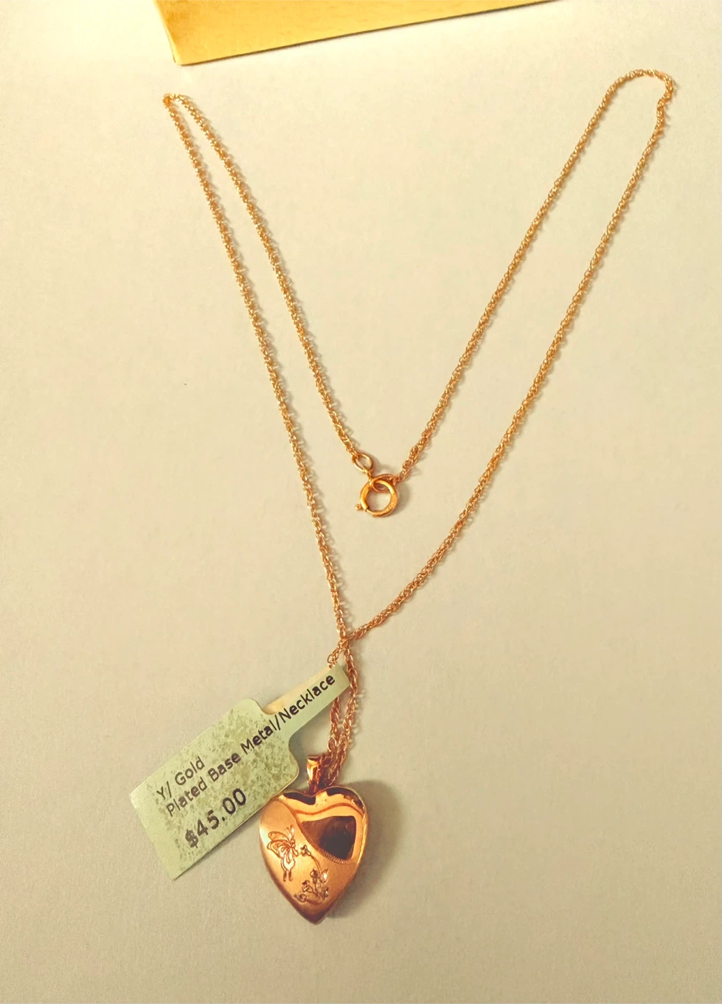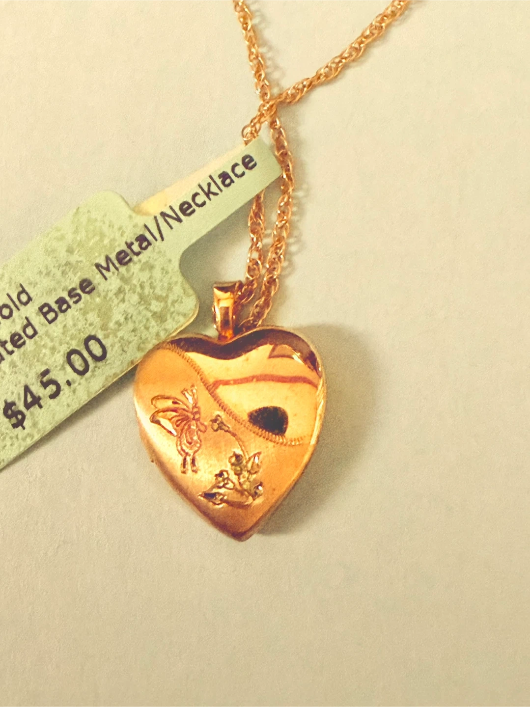 New with tag and box. A gold-toned locket necklace shaped like a heart. The chain is delicate and measures 18” long. It's cute for keeping small mementos.