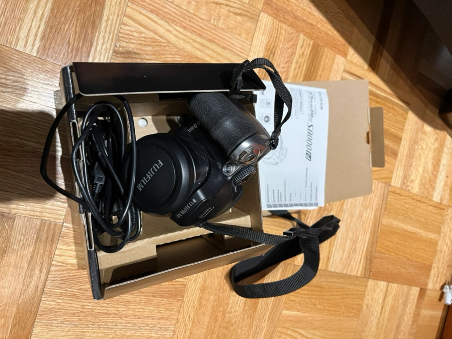 Fuji camera S8000fd , great for beginners, comes with box , instructions, sd card , fresh AA 4 batteries , cables so you can check your work on tv screen.