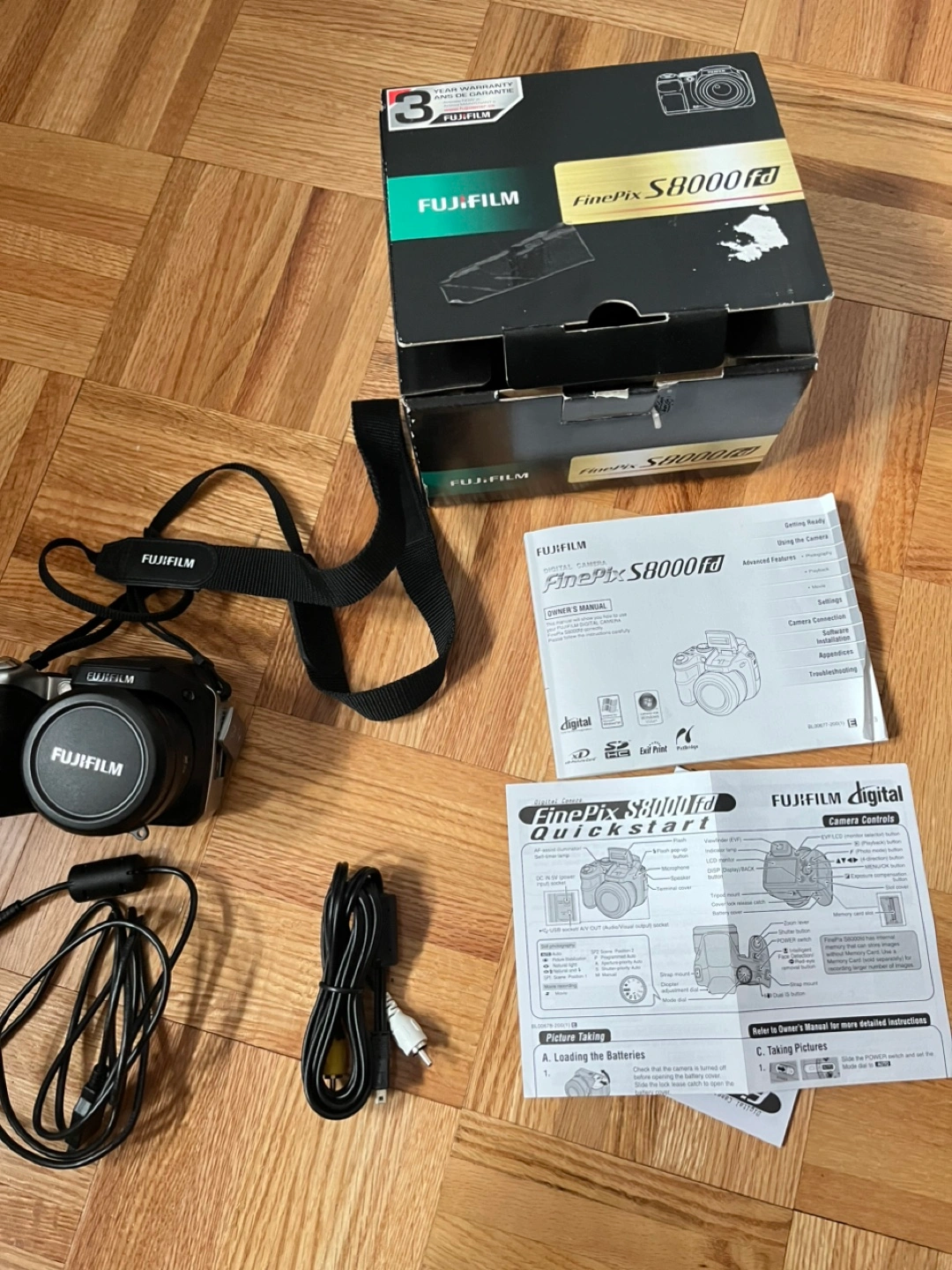 Fuji camera S8000fd , great for beginners, comes with box , instructions, sd card , fresh AA 4 batteries , cables so you can check your work on tv screen.