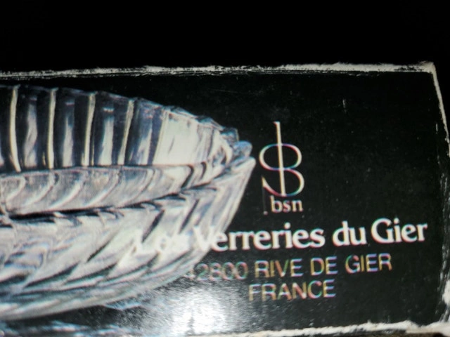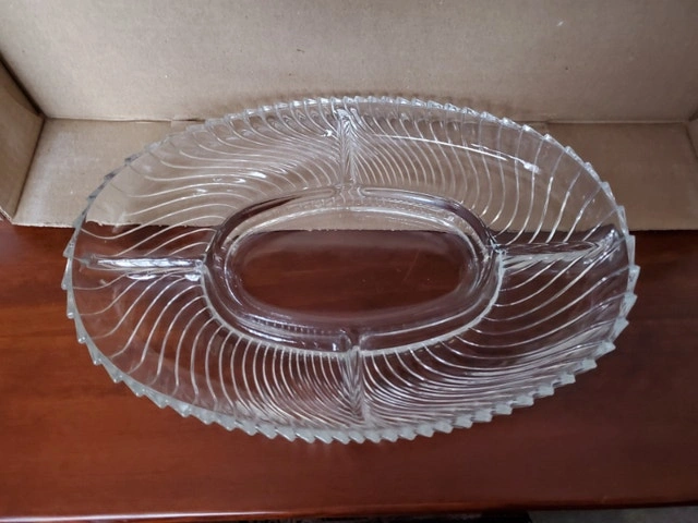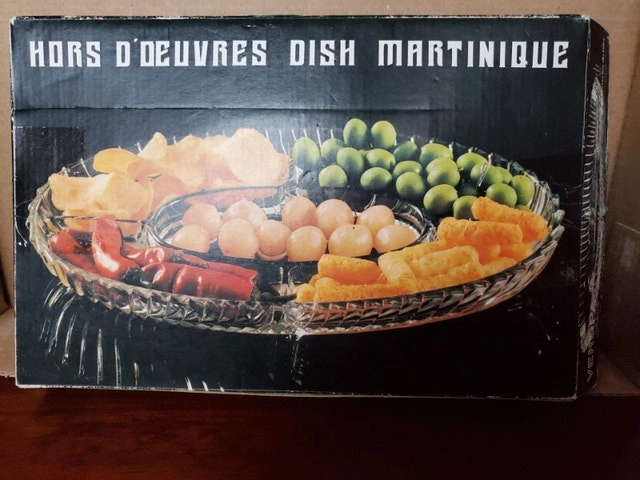 A vintage hors d'oeuvres dish by Veropa (Verreries du Gier). Made in France, the model is "Martinque". It's heavy glass, 5-sections, oval-shaped and measures about 12.25" x 8.25". It's in the original box. $10.00, pick up only
