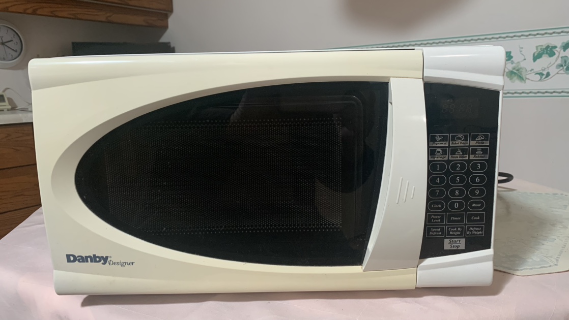 Microwave in excellent condition. It comes with a turntable and is easy to operate. It is perfect for heating up leftovers or cooking a quick meal. It has a digital display that shows the time, power level, and cooking time. It also has a variety of cooking functions that include defrosting, reheating, and cooking by weight. It is in working order, and ready to be used.