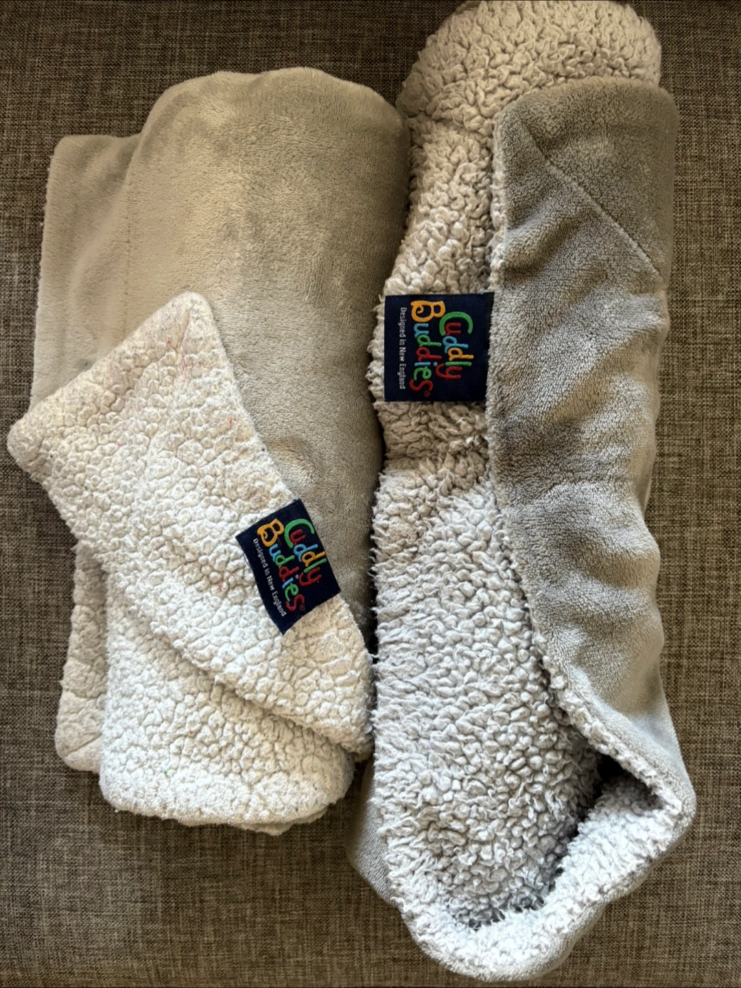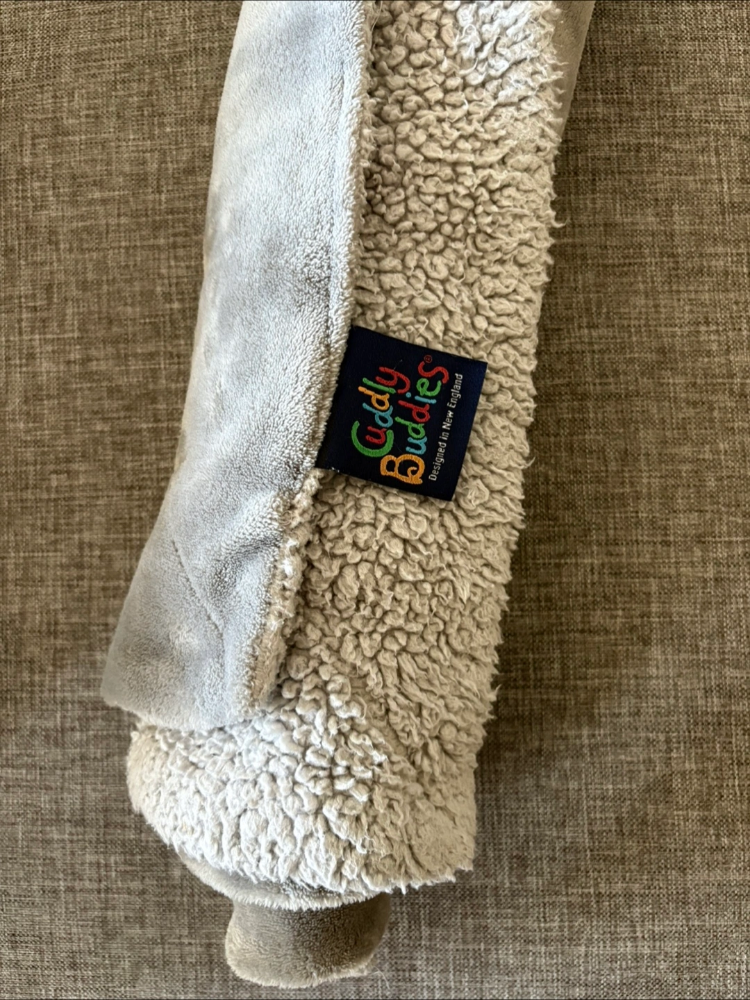 Keep your little one cozy with this Cuddly Buddies blanket! It features a soft grey plush on one side and a fluffy white sherpa material on the other. Perfect for snuggling up!