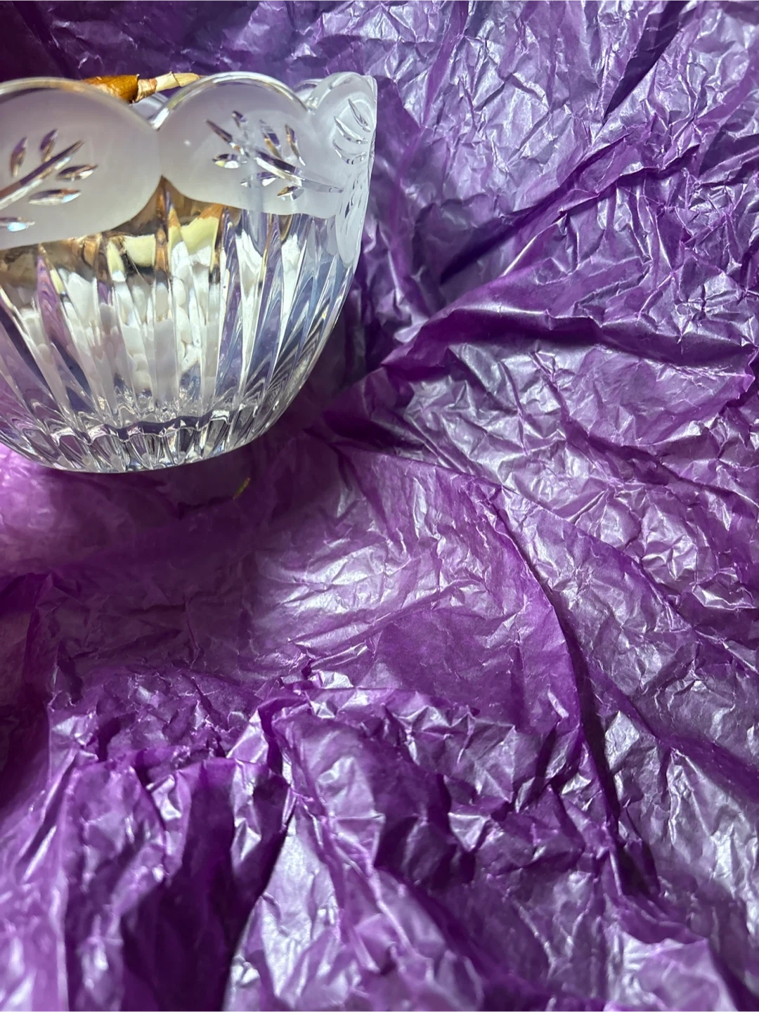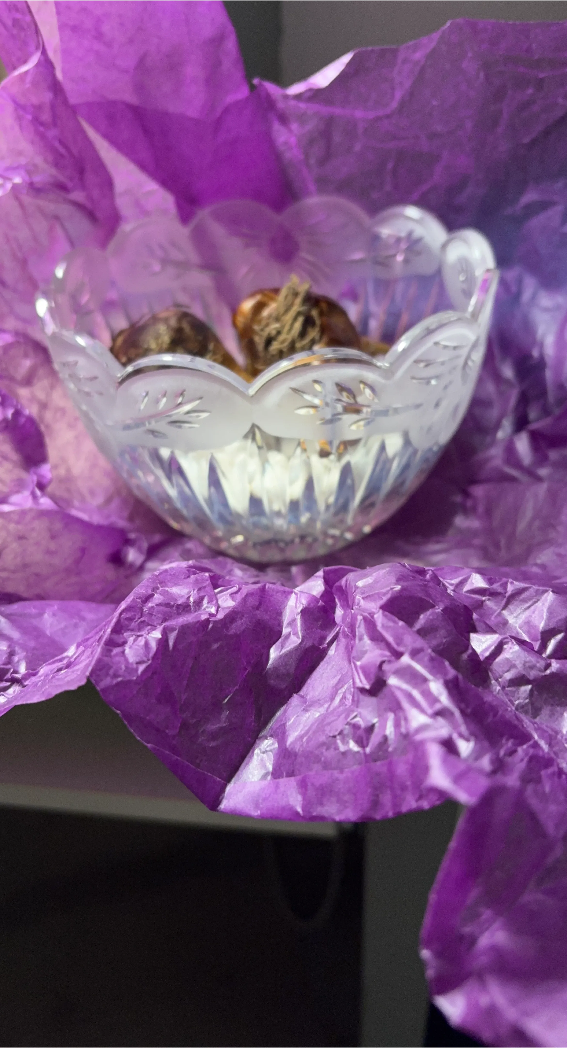 Decorative crystal glass bowl. Features etched leaf detailing on the rim and a faceted base. Contains dried flower buds. Perfect and ready to grow for paper white spring flower buds!