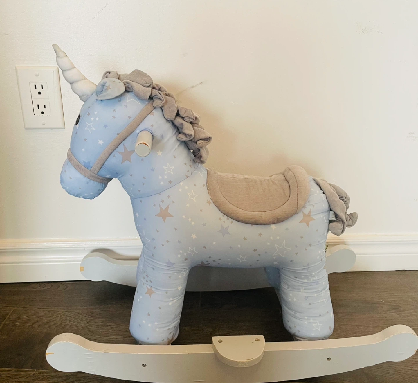 This adorable plush unicorn rocker is perfect for little ones. It's designed with a soft, light blue fabric covered in stars and a grey mane and tail. The sturdy wooden base ensures a safe and fun rocking experience.