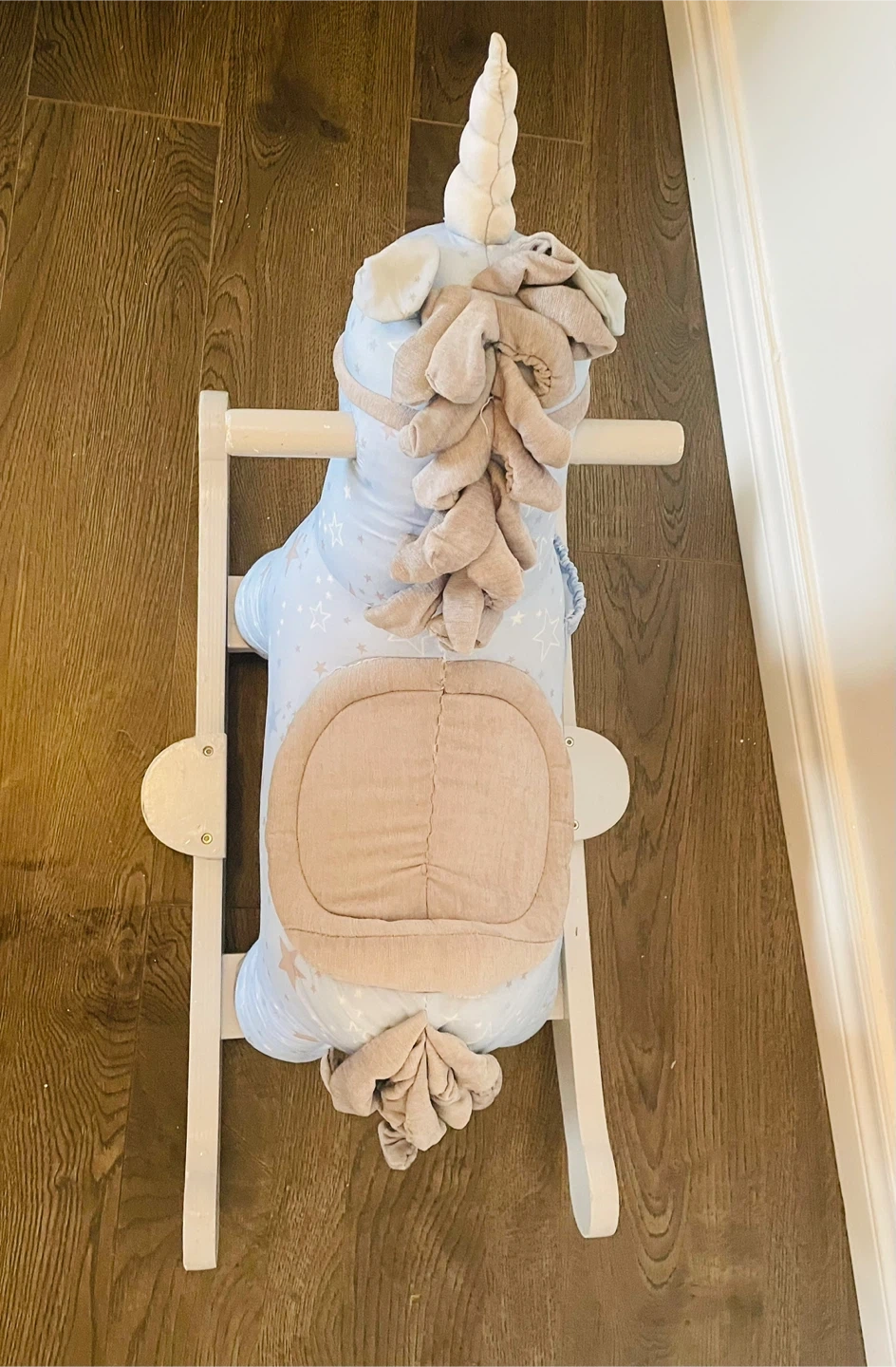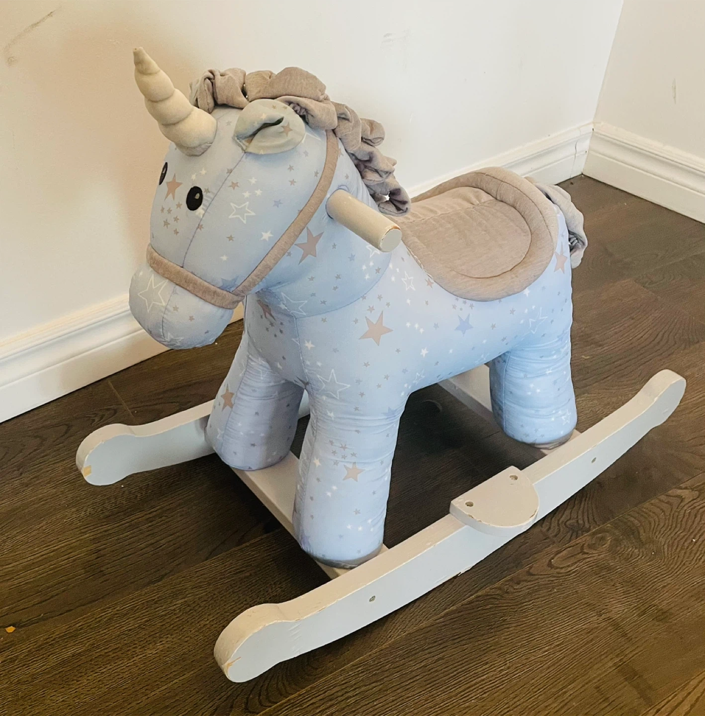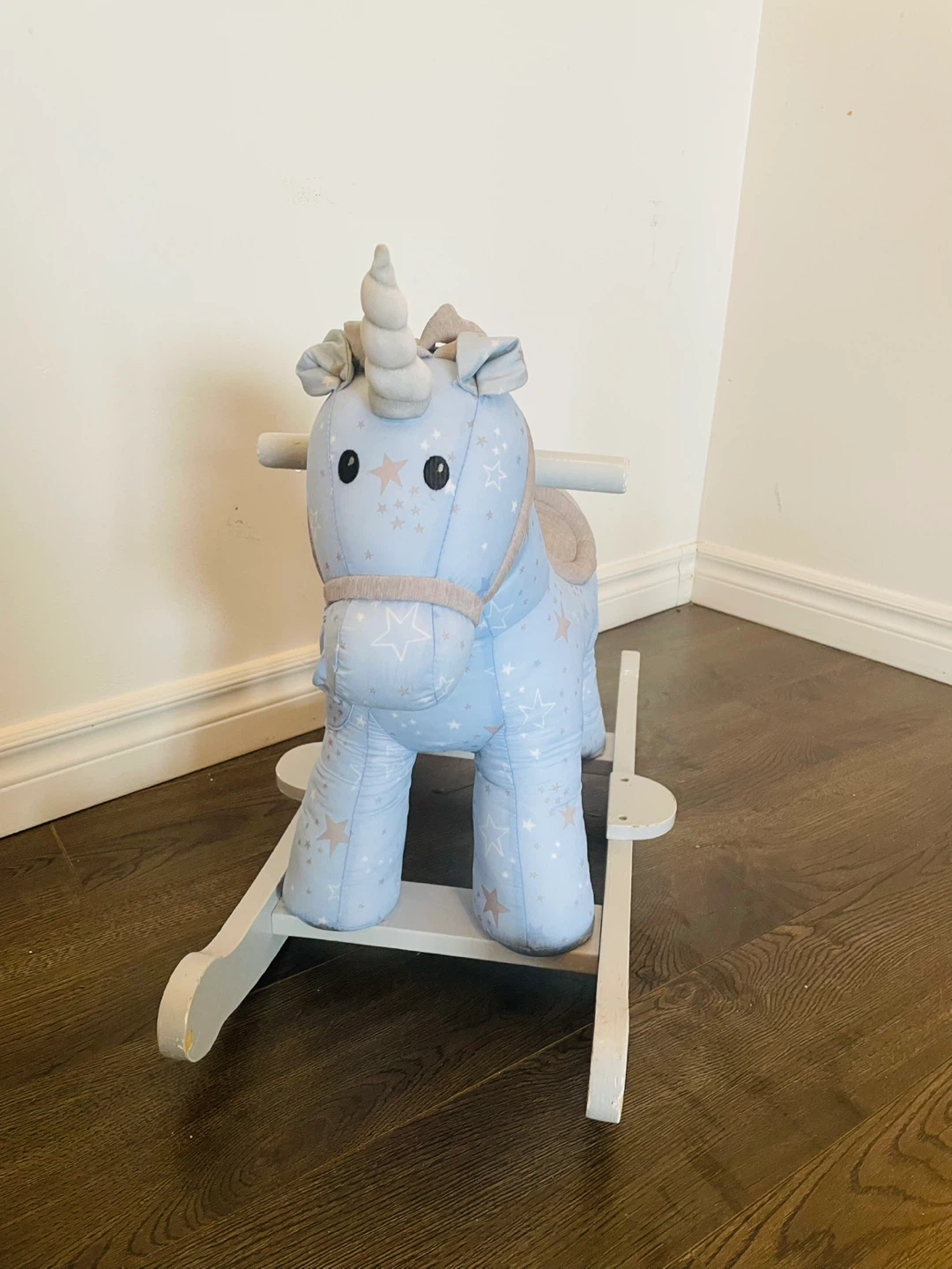 This adorable plush unicorn rocker is perfect for little ones. It's designed with a soft, light blue fabric covered in stars and a grey mane and tail. The sturdy wooden base ensures a safe and fun rocking experience.