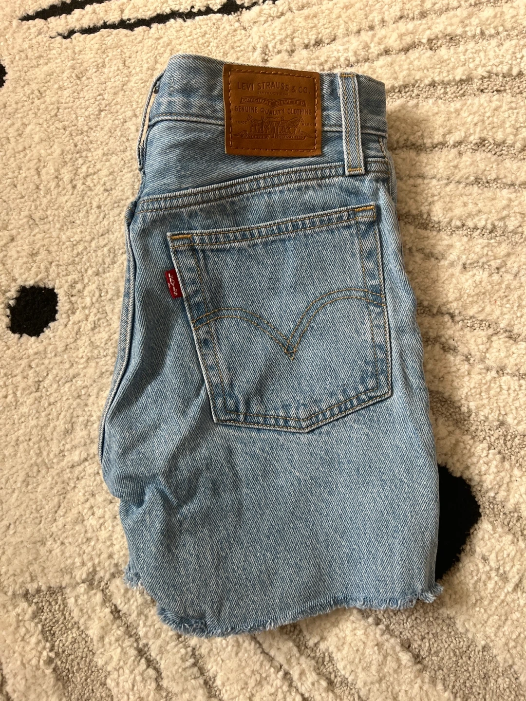 These are classic Levi's denim shorts in a light wash. They feature a button-fly closure and a raw hem. Made from durable denim.